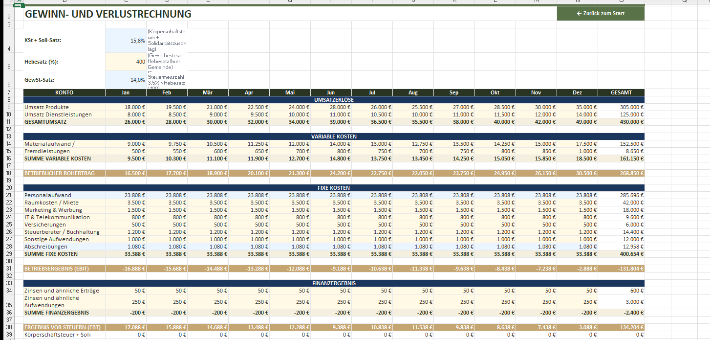Vollständige GuV pro Monat (Gesamtkostenverfahren) mit Umsatz, variablen und fixen Kosten, Rohertrag, EBIT, Finanzergebnis, KSt + Soli, Gewerbesteuer und Jahresüberschuss. Hebesatz konfigurierbar.