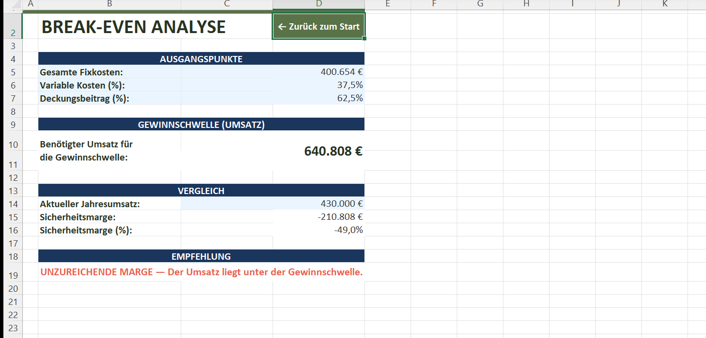 Berechnung Ihres Break-even-Umsatzes auf Basis der Fixkosten und des Deckungsbeitrags. Vergleich mit aktuellem Umsatz und Statusmeldung.