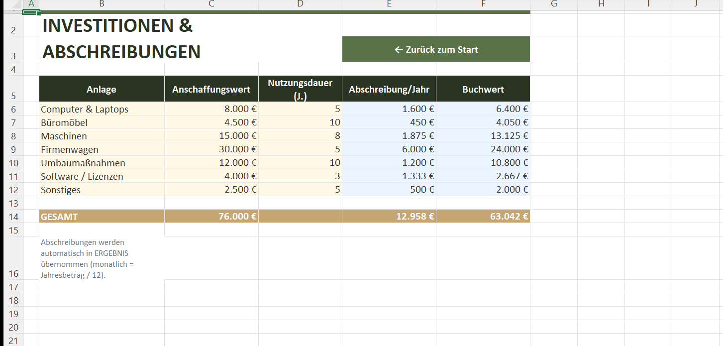 Die Vorlage enthält 10 Arbeitsblätter mit über 460 automatischen Formeln und 2 Diagrammen. Alle Blätter sind miteinander verknüpft: Personalkosten, Abschreibungen, USt und Körperschaftsteuer fließen automatisch in Ihre GuV und Liquiditätsplanung ein.