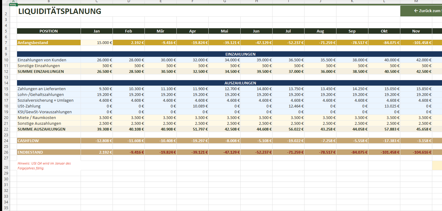 Cashflow-Übersicht pro Monat mit Einzahlungen, Auszahlungen und Endbestand. Anfangs- und Endbestand in Kaskadenberechnung.