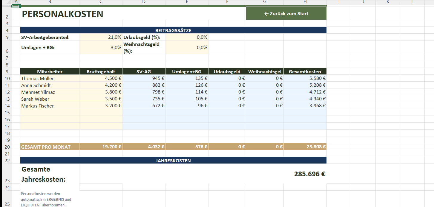 Berechnen Sie die Gesamtkosten pro Mitarbeiter inkl. SV-Arbeitgeberanteil (21%), Umlagen + BG (3%), Urlaubsgeld und Weihnachtsgeld. Platz für 8 Mitarbeiter, alle Prozentsätze anpassbar.