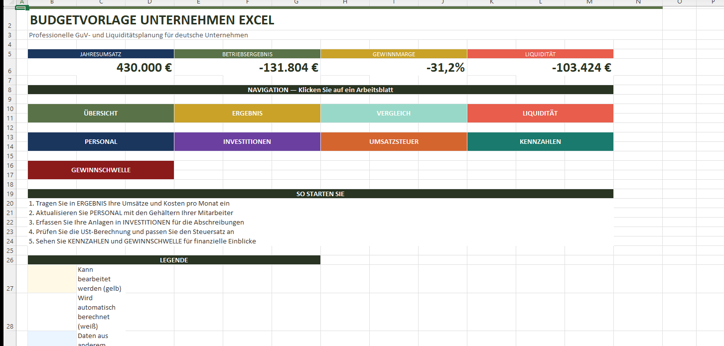 Eine vollständige Budgetvorlage in Excel mit Gewinn- und Verlustrechnung, Liquiditätsplanung, Personalkostenkalkulator, USt-Übersicht, finanziellen Kennzahlen und Gewinnschwelle-Analyse. Inklusive Dashboard mit Diagrammen und Soll-Ist-Vergleich. Entwickelt für deutsche Kapitalgesellschaften (GmbH/AG) und den Mittelstand.