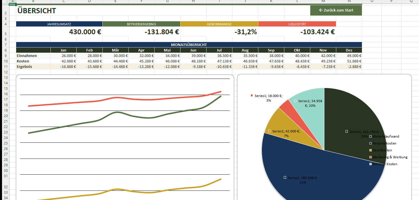 In 10 Minuten haben Sie eine vollständige GuV und Liquiditätsplanung mit Dashboard, Personalkostenkalkulator und finanziellen Kennzahlen — bereit für Ihre Unternehmensplanung.