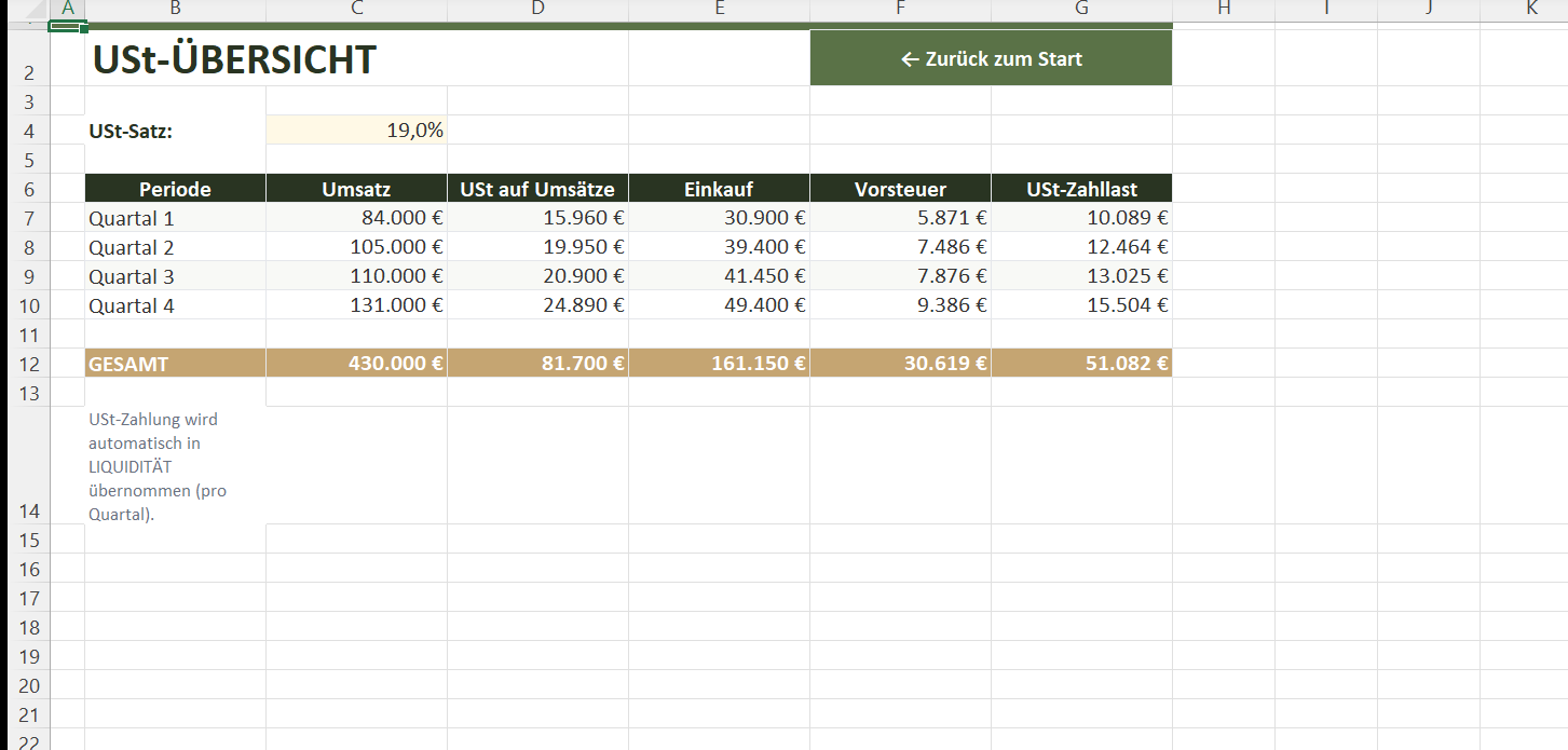 - USt-Übersicht pro Quartal und automatische KSt/GewSt-Berechnung