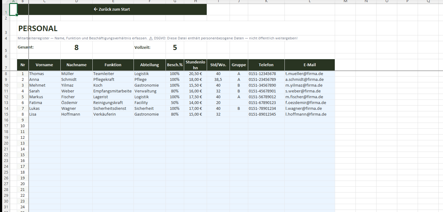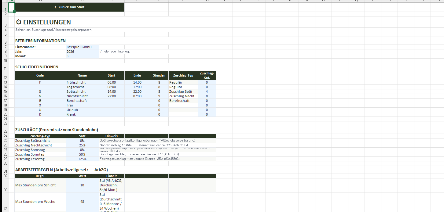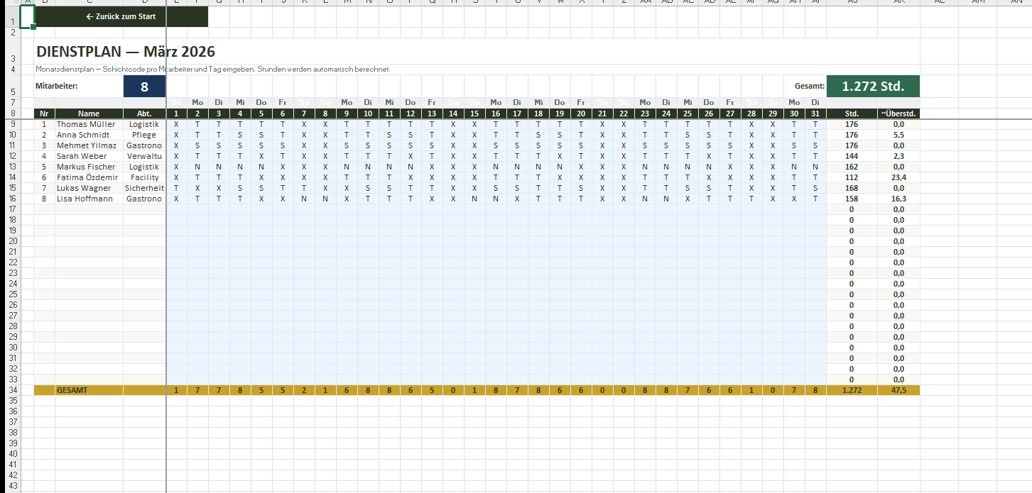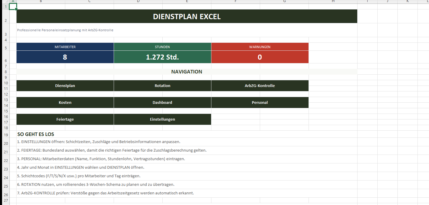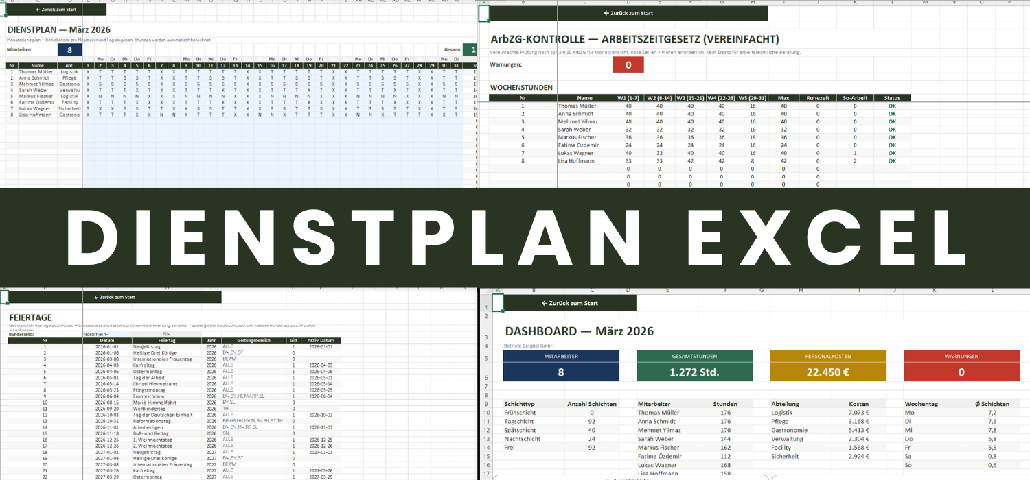 In 5 Minuten einsatzbereit: Dienstplan, ArbZG-Kontrolle, Personalkosten und Bundesland-Feiertage — alles in einer Excel-Datei für Ihr Team.