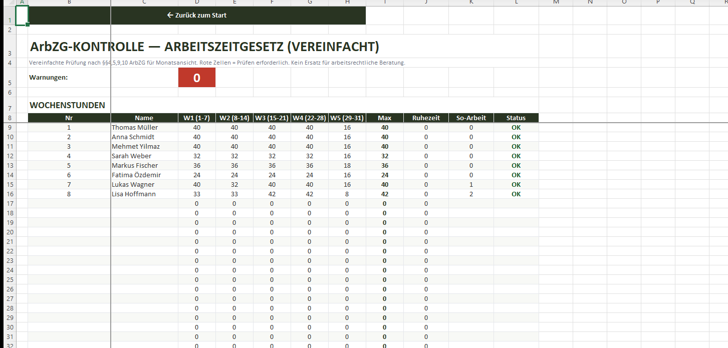 Diese Vorlage ist ein Hilfsmittel und ersetzt keine arbeitsrechtliche Beratung. Berechnungen können Fehler enthalten oder aktuelle gesetzliche Änderungen nicht abbilden. Der Anbieter übernimmt keine Haftung für Entscheidungen, die auf Basis dieser Vorlage getroffen werden. Konsultieren Sie bei Fragen stets einen Fachanwalt für Arbeitsrecht oder Ihren Betriebsrat.