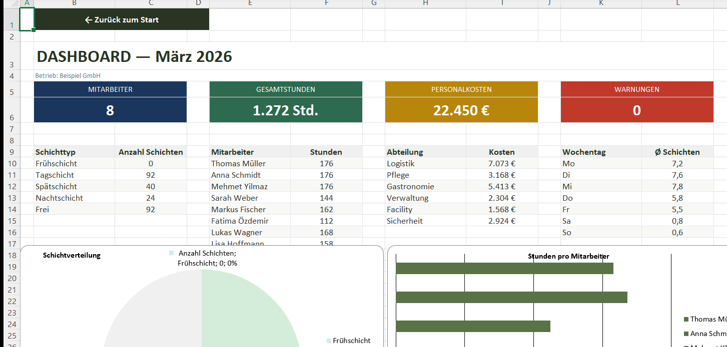 Dieser Dienstplan in Excel bringt alles zusammen: 9 Arbeitsblätter mit 1.000+ Formeln, 4 Diagrammen und Platz für 25 Mitarbeiter. Planen Sie Monat für Monat, prüfen Sie ArbZG-Konformität automatisch und berechnen Sie Personalkosten inklusive aller Zuschläge — ohne Makros, direkt in Excel.