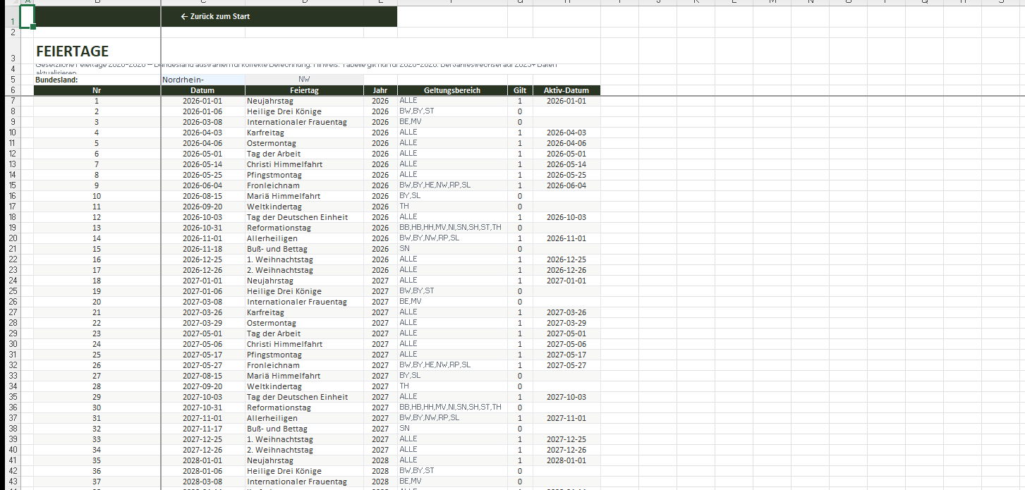 • Bundesland-Selektor: Feiertage 2026–2028 automatisch gefiltert für alle 16 Bundesländer