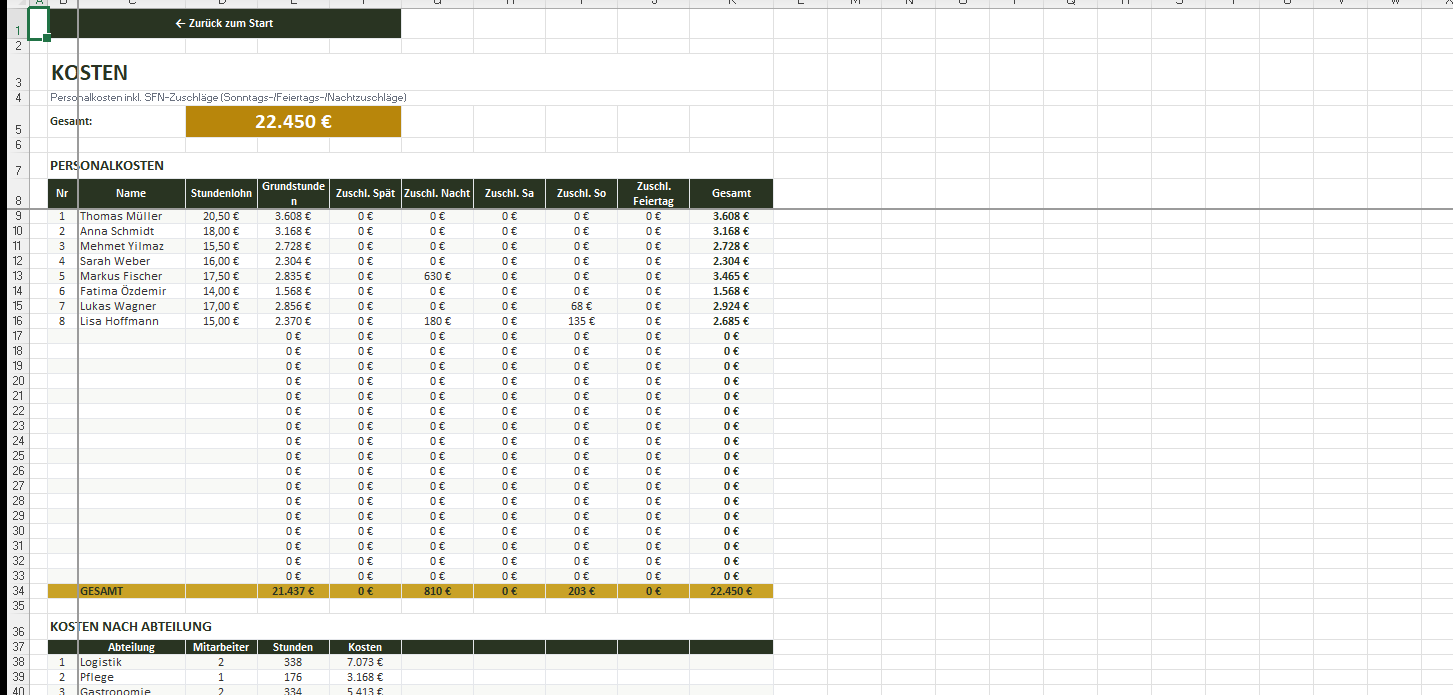 Kostenberechnung pro Mitarbeiter mit 5 unabhängig konfigurierbaren Zuschlägen: Spätschicht, Nachtschicht, Samstag, Sonntag und Feiertag. Samstag und Sonntag werden getrennt berechnet.