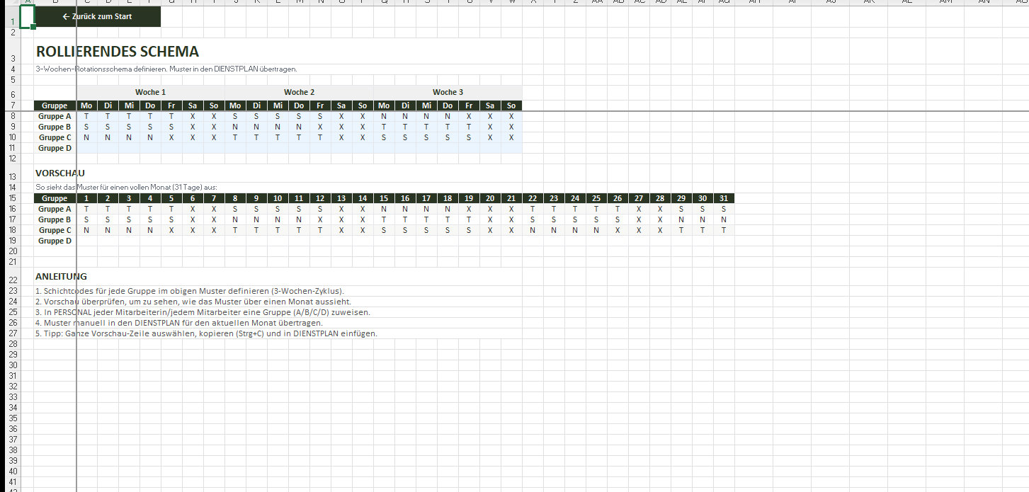 • Rollierender 3-Wochen-Schichtplan mit 4 Gruppen — einmal einrichten, dauerhaft nutzen