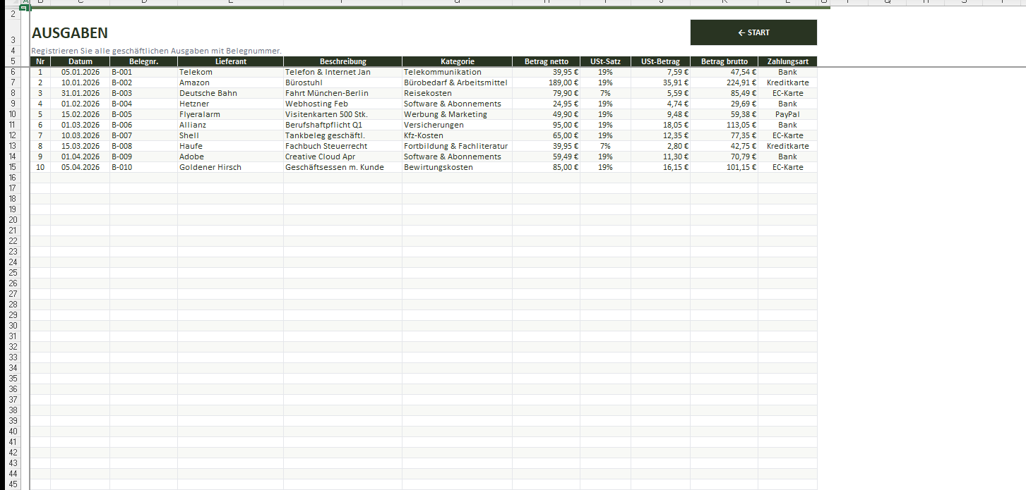 Erfassen Sie geschäftliche Ausgaben mit Belegnummer, Kategorie und Zahlungsart. Automatische USt-Berechnung pro Zeile.