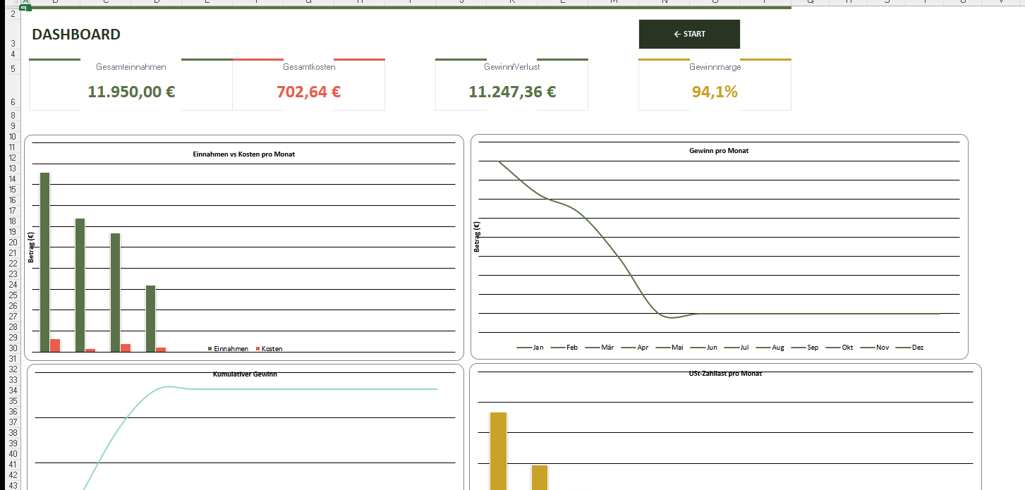 Visuelles Dashboard mit 5 Grafiken: Einnahmen vs Kosten, Gewinn, kumulatives Ergebnis, USt und Kostenverteilung.