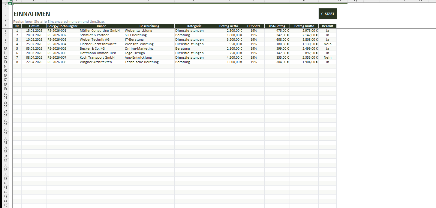 Erfassen Sie bis zu 500 Rechnungen und 500 Ausgaben pro Jahr. Automatische USt-Berechnung (19%, 7%, 0%) pro Zeile mit Belegnummer für die Nachvollziehbarkeit.