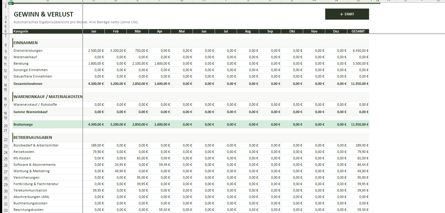 Monatliche Ergebnisübersicht mit Einnahmen pro Kategorie, Wareneinkauf, 14 Betriebsausgabenkategorien und Nettoresultat. Bewirtungskosten automatisch auf 70% begrenzt.