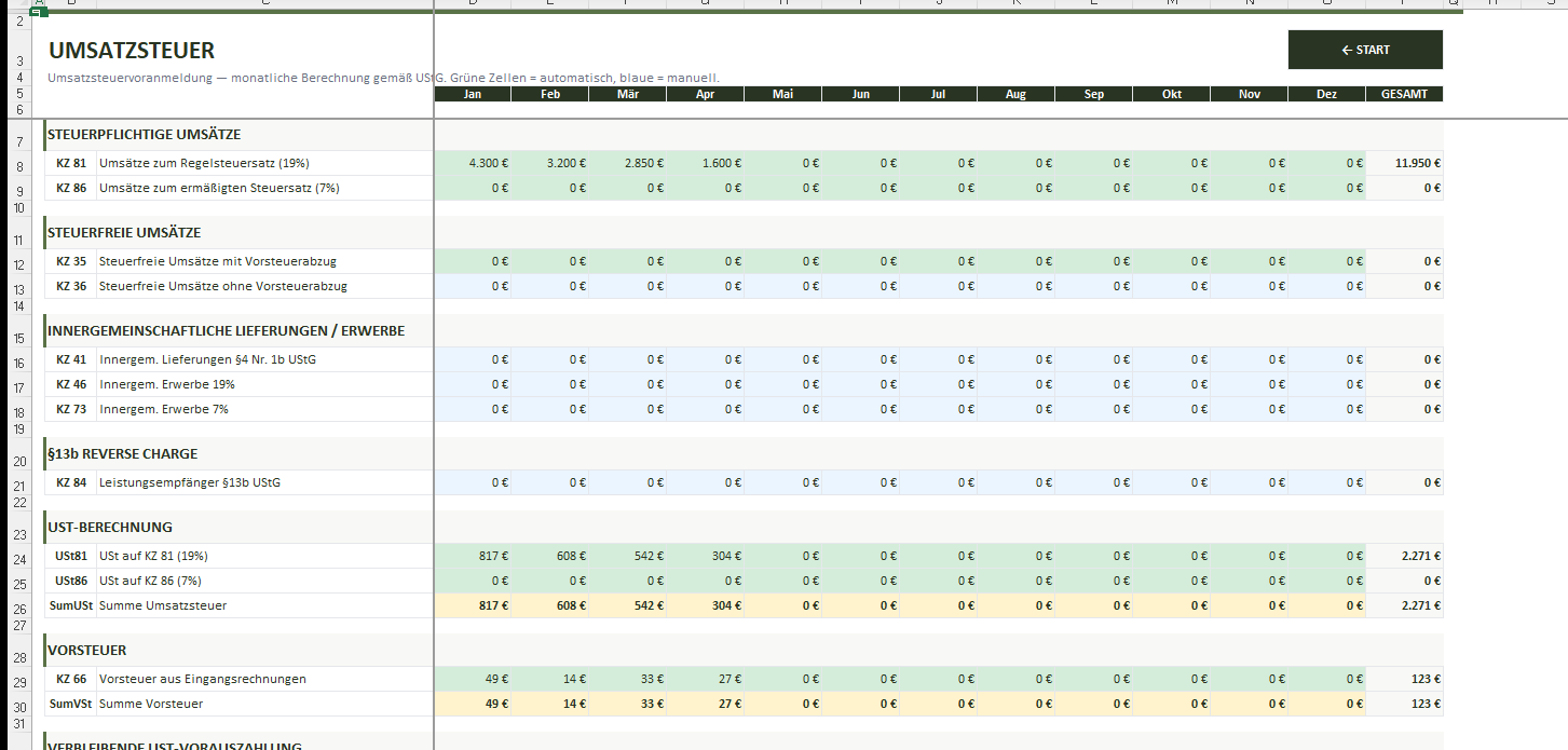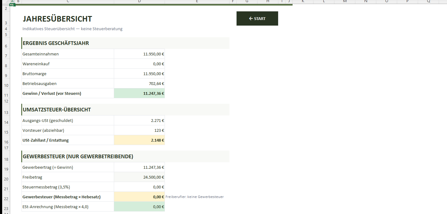 Disclaimer: Diese Vorlage dient als Hilfsmittel für Ihre interne Übersicht und ersetzt keine professionelle Steuerberatung. Die USt-Berechnungen und steuerlichen Schätzungen sind indikativ. Verwenden Sie ELSTER für Ihre offizielle Steuererklärung. Das Excel erfüllt nicht die GoBD-Anforderungen an eine unveränderbare Buchführung.