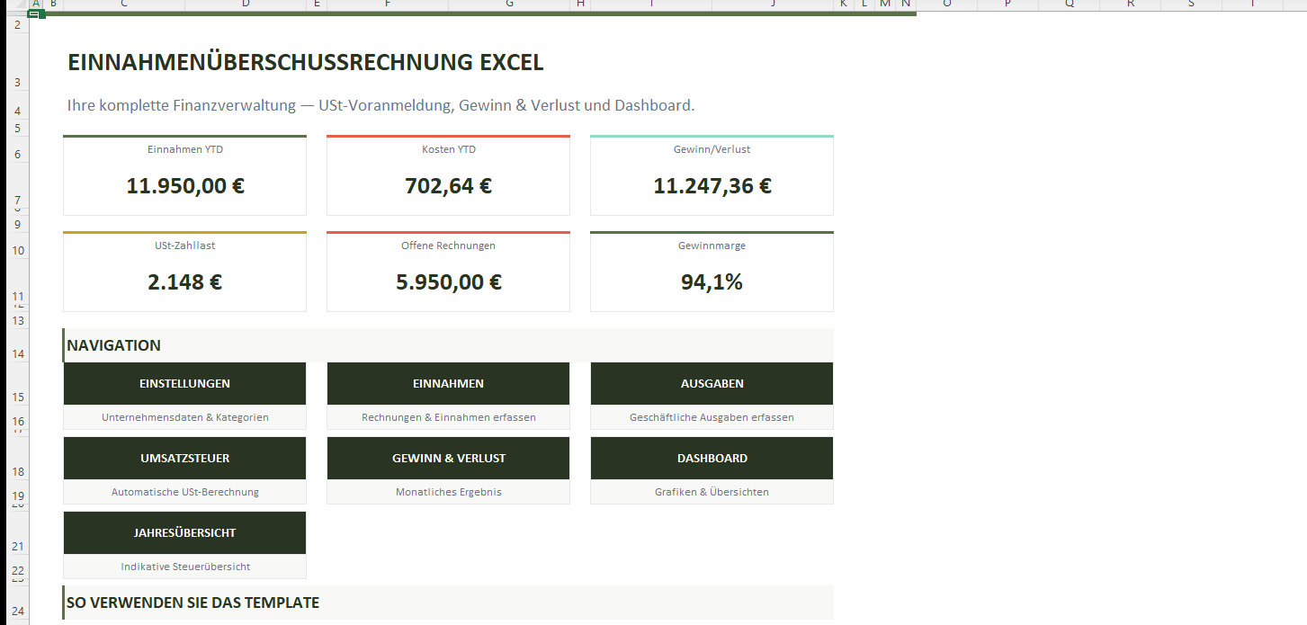 Komplette EÜR in Excel — USt-Voranmeldung, Gewinn & Verlust und Dashboard automatisch berechnet