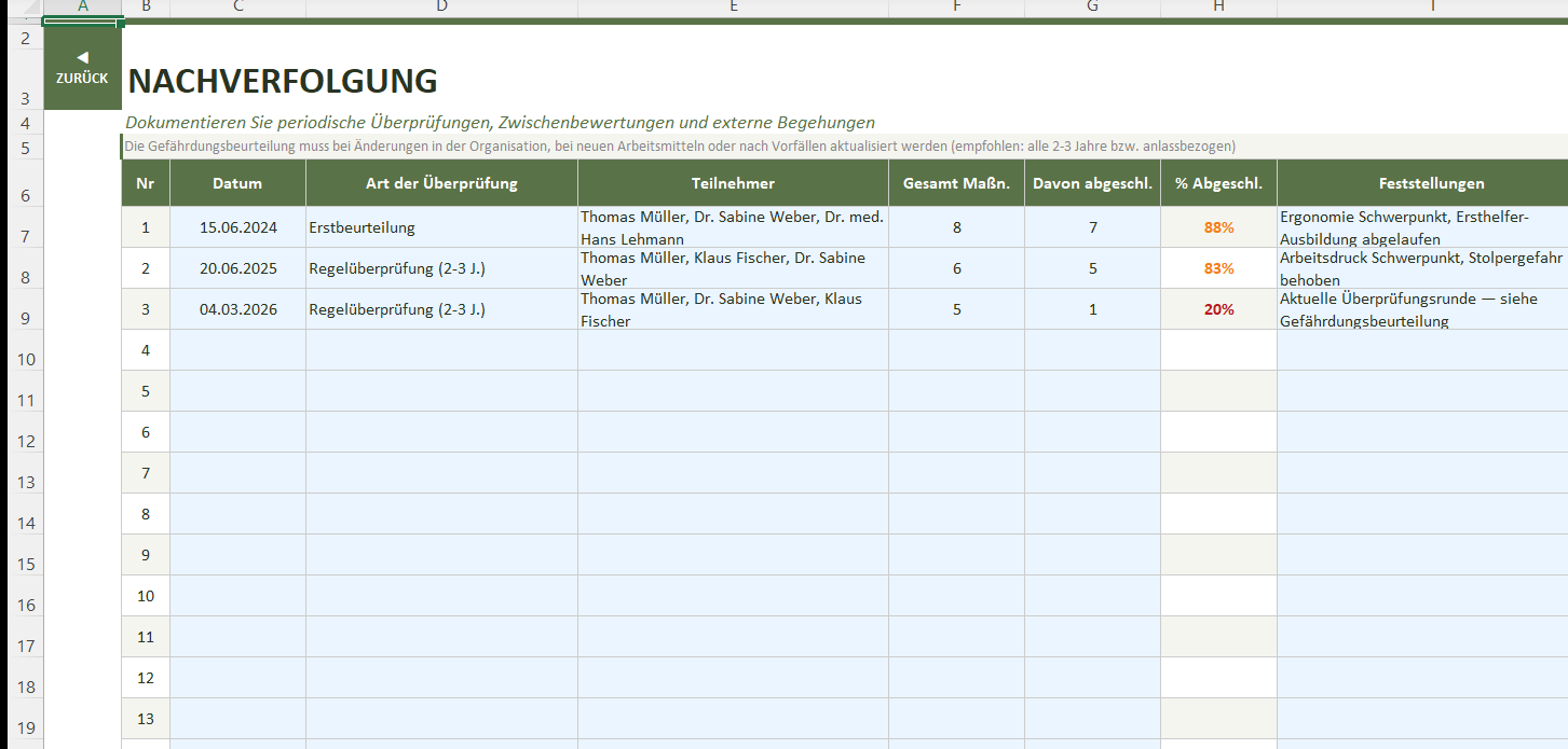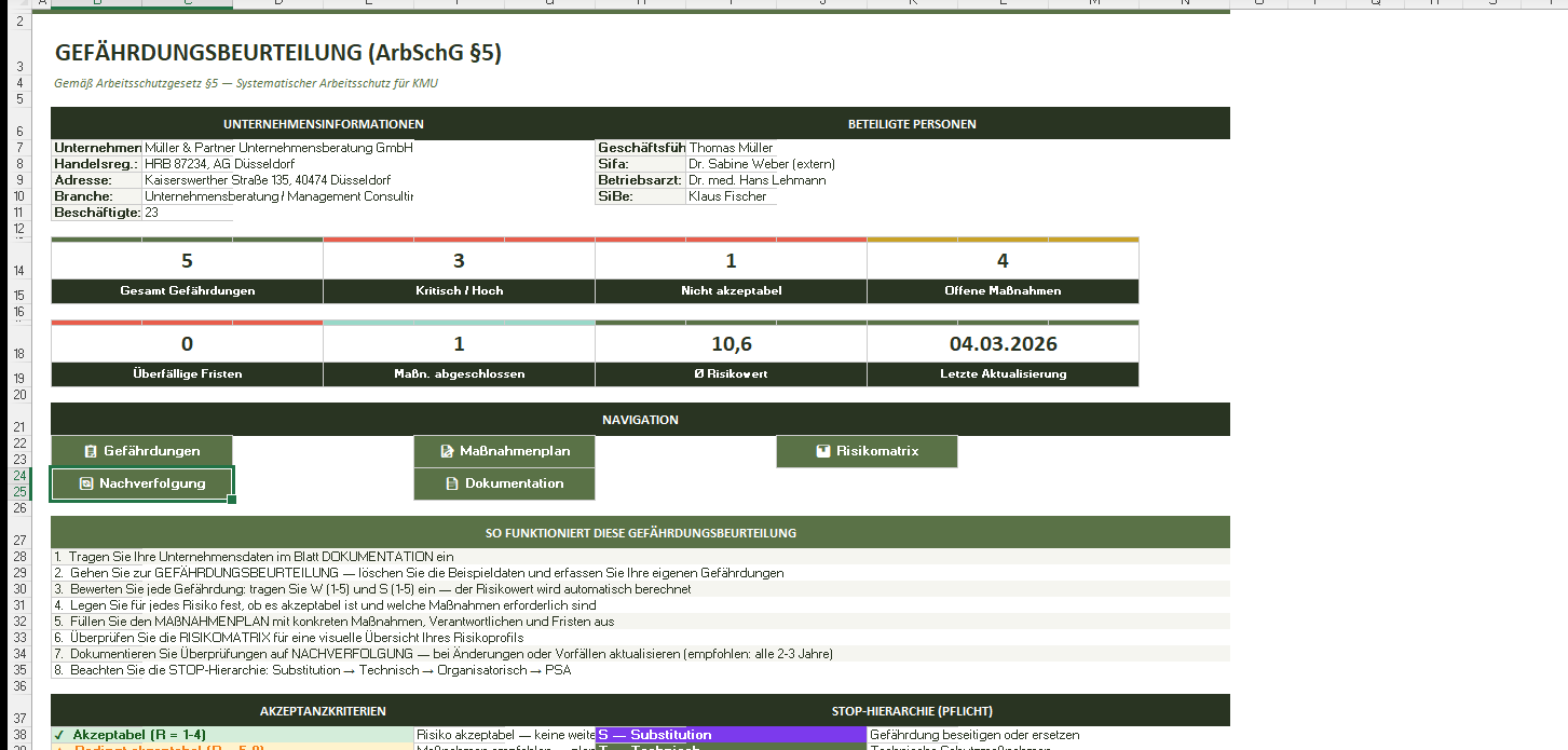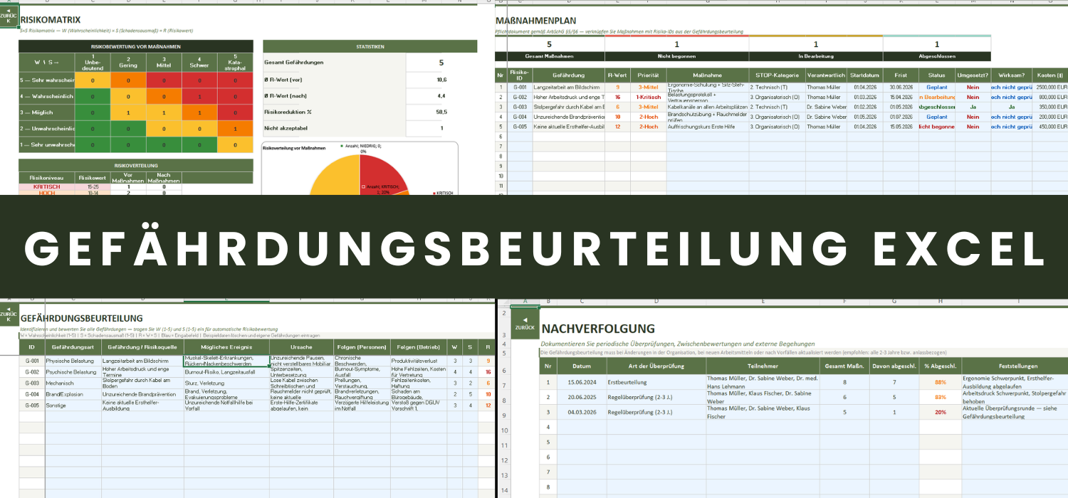 Sie benötigen eine Gefährdungsbeurteilung gemäß ArbSchG §5, wissen aber nicht, wo Sie anfangen sollen? Diese Excel-Vorlage führt Sie Schritt für Schritt durch den gesamten Prozess — von der Gefährdungsidentifikation bis zur dokumentierten Wirksamkeitsprüfung.
