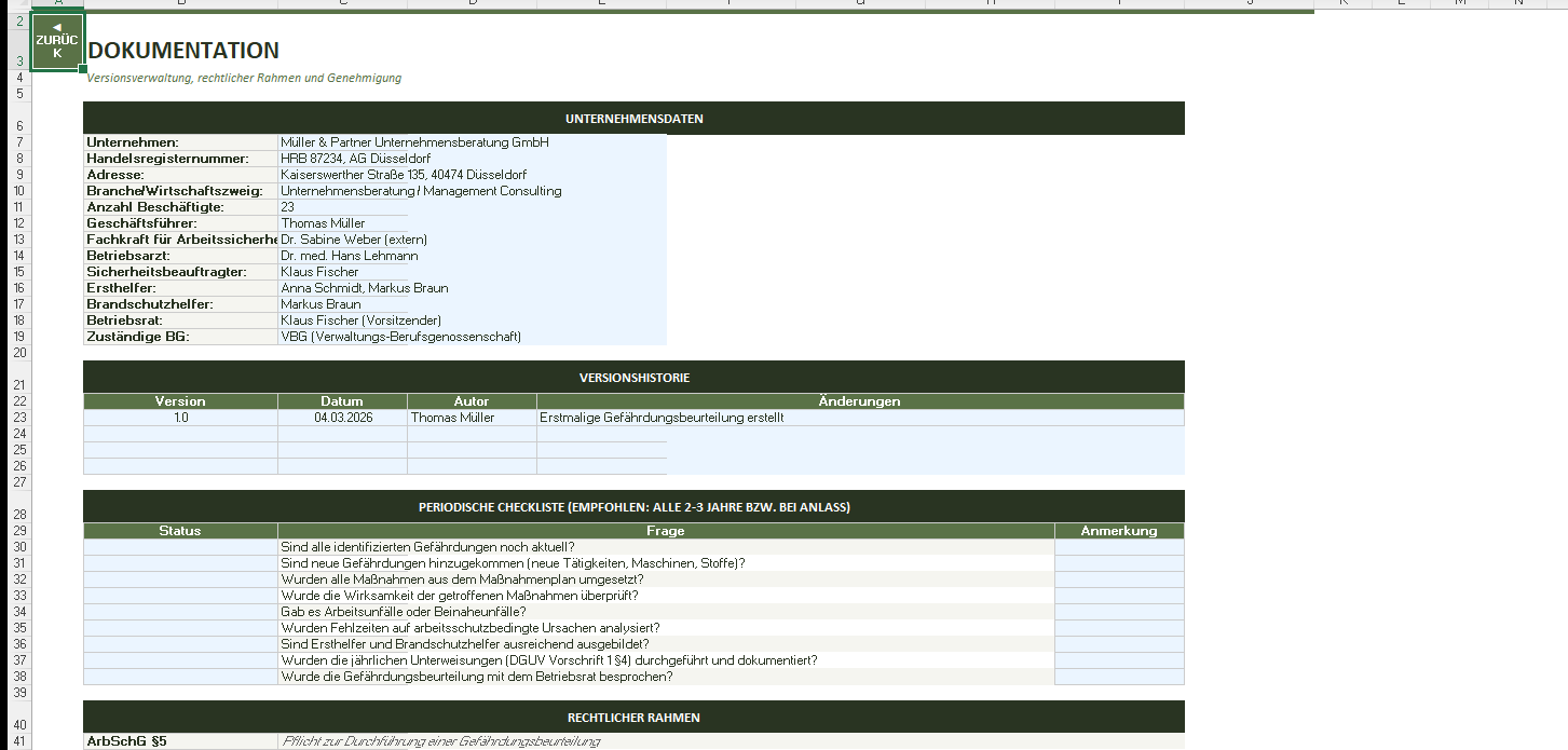 Unternehmensdaten, Versionshistorie, periodische Checkliste, rechtlicher Rahmen (ArbSchG, DGUV) und Genehmigung mit Unterschriftsfeldern.