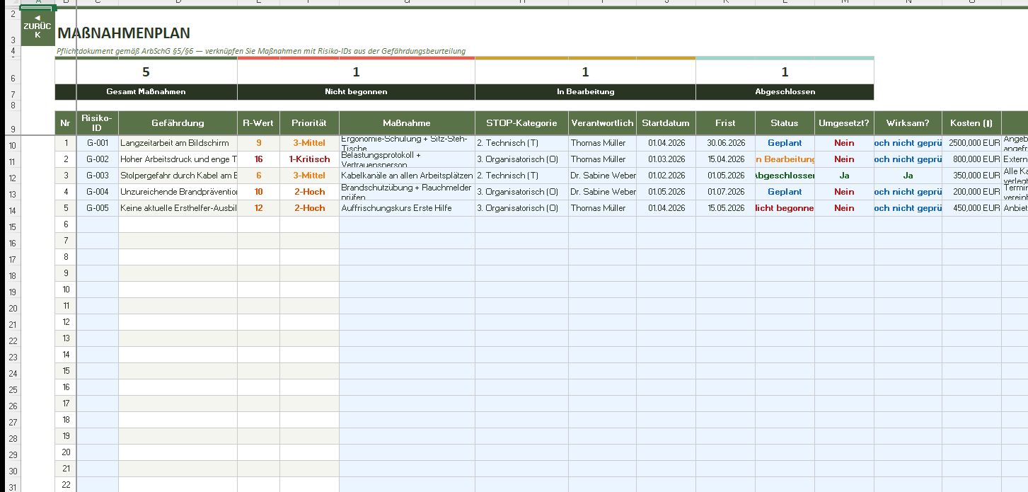 Verknüpft mit dem Gefährdungsregister per Risiko-ID. Enthält STOP-Klassifizierung, Fristen, Kosten sowie Durchführungs- und Wirksamkeitskontrolle.