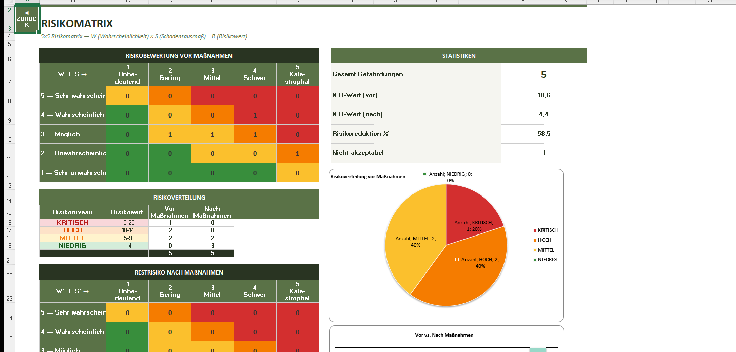 5×5-Matrix vor und nach Maßnahmen mit farbcodierter Heatmap. Risikoverteilung, Akzeptanzstatus und 4 automatische Diagramme.