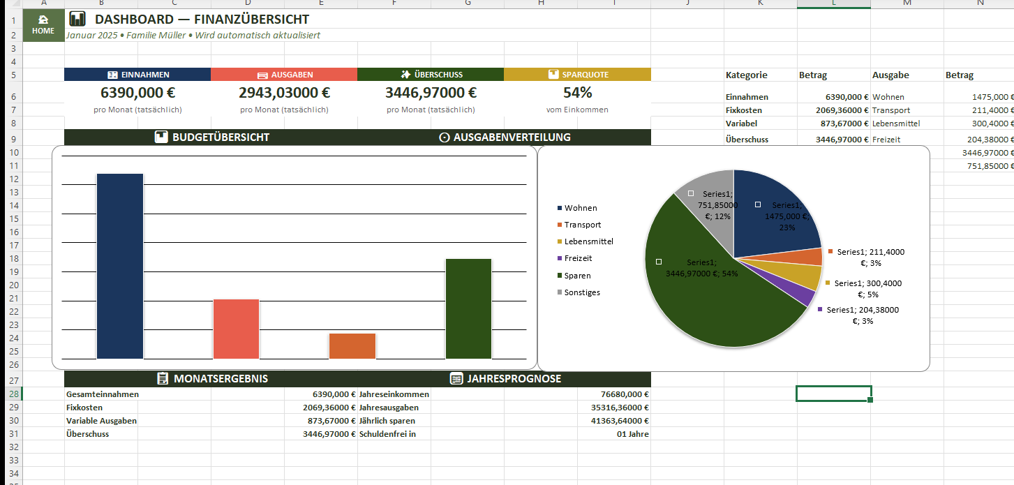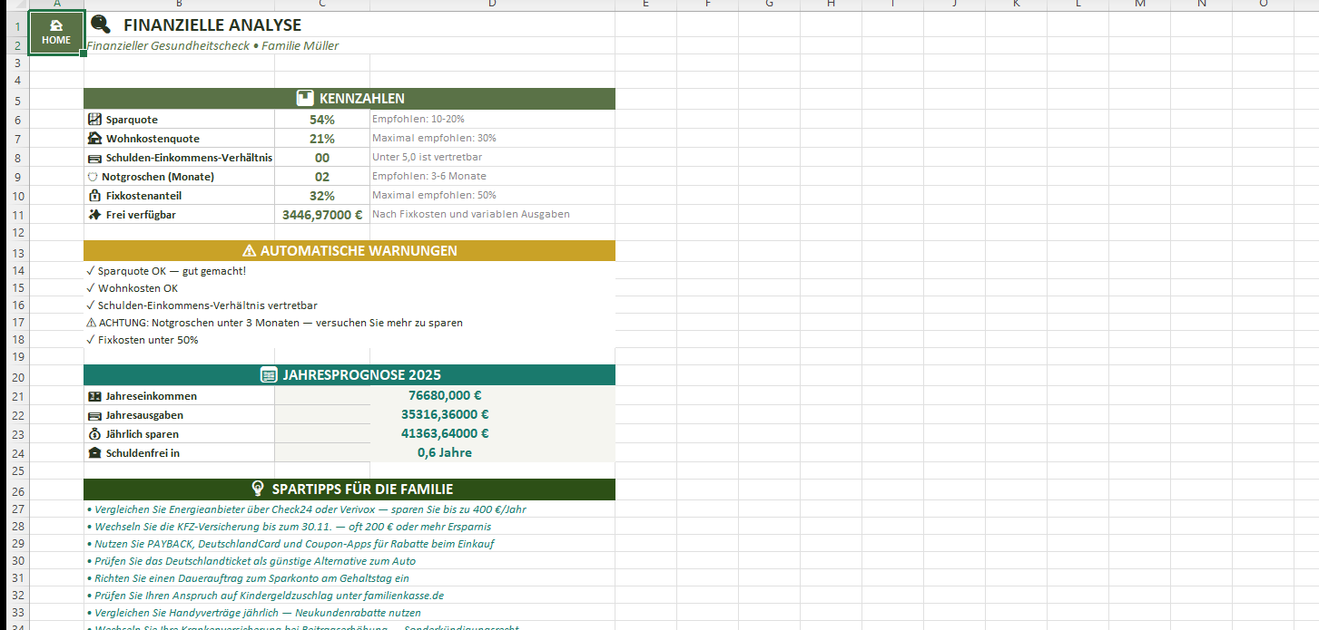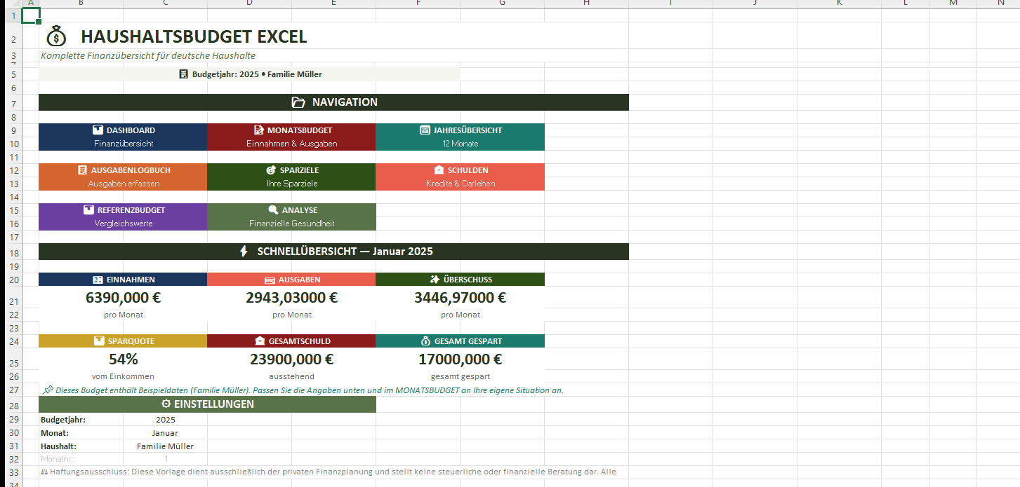 In 5 Minuten haben Sie ein komplettes Haushaltsbudget mit Monatsplan, Jahresübersicht, Sparzielen und Finanzanalyse — fertig für Ihre persönliche Finanzplanung.