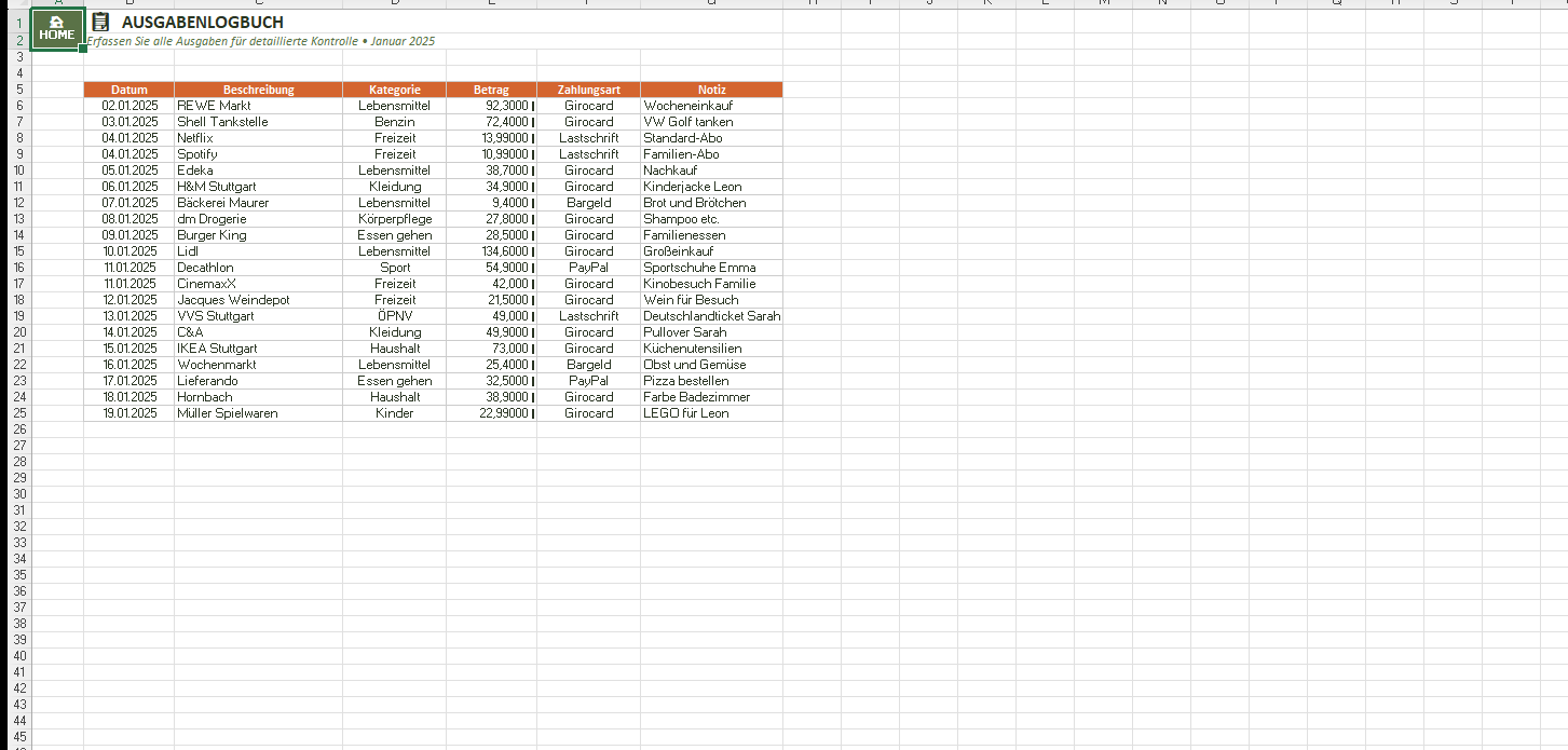 Erfassen Sie bis zu 500 Ausgaben mit Datum, Beschreibung, Kategorie, Betrag und Zahlungsart. Automatisch mit dem Monatsbudget verknüpft über SUMPRODUCT-Formeln mit Monats- und Jahresfilter.