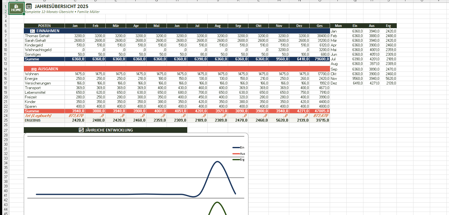 12-Monats-Übersicht mit allen Einnahmen und Ausgaben. Trendgrafik zeigt Ihre finanzielle Entwicklung über das Jahr. Ist-Zeile aus dem Logbuch für Plan-Ist-Vergleich.