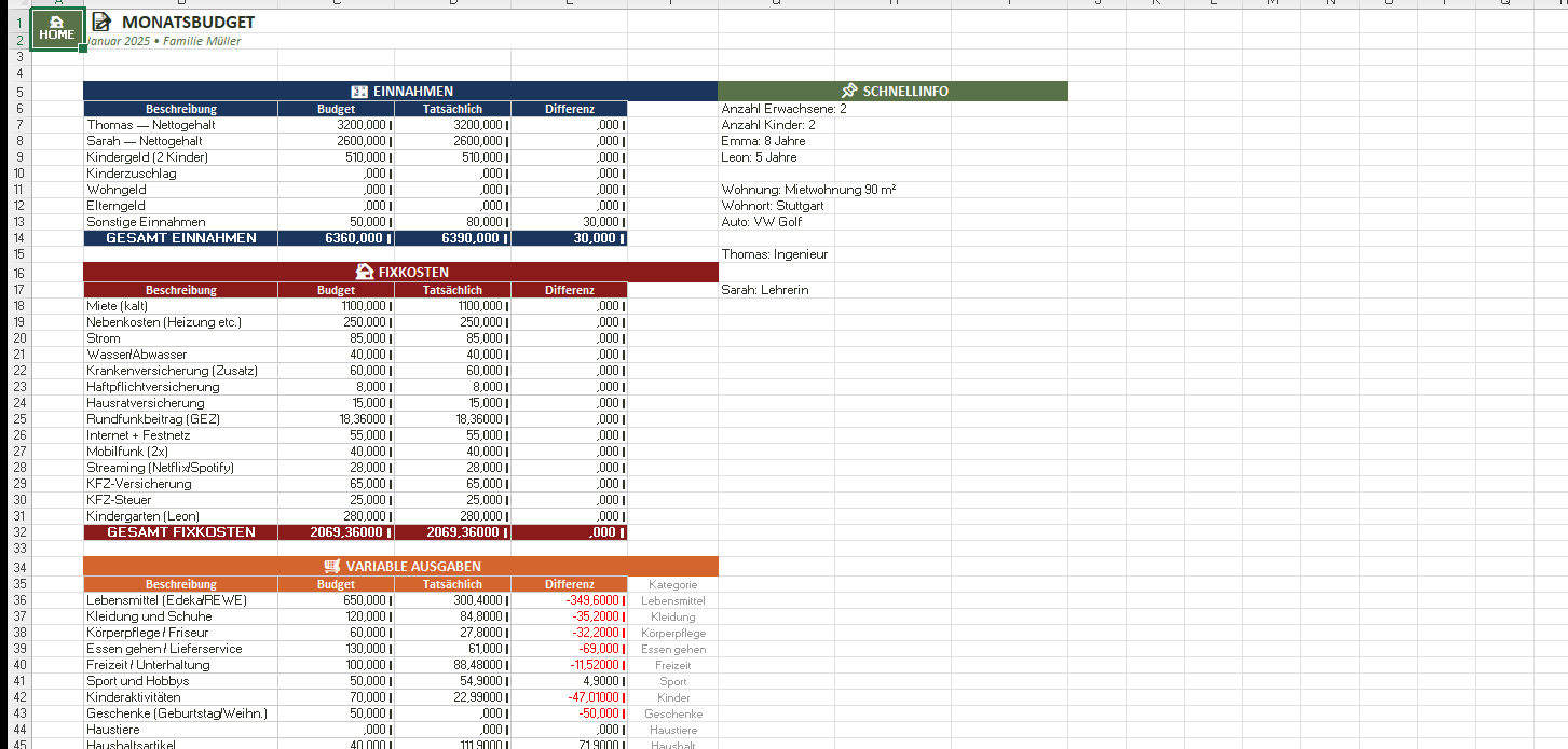 Detaillierte Aufstellung mit Einnahmen (Nettolohn, Kindergeld, Weihnachtsgeld), Fixkosten und variablen Ausgaben. Budget versus Tatsächlich mit automatischer Differenz.