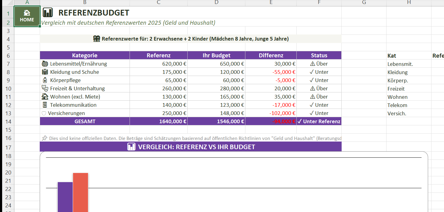 Komplettes Haushaltsbudget mit Monatsplan, Jahresübersicht, Sparzielen und Referenzbudget-Vergleich