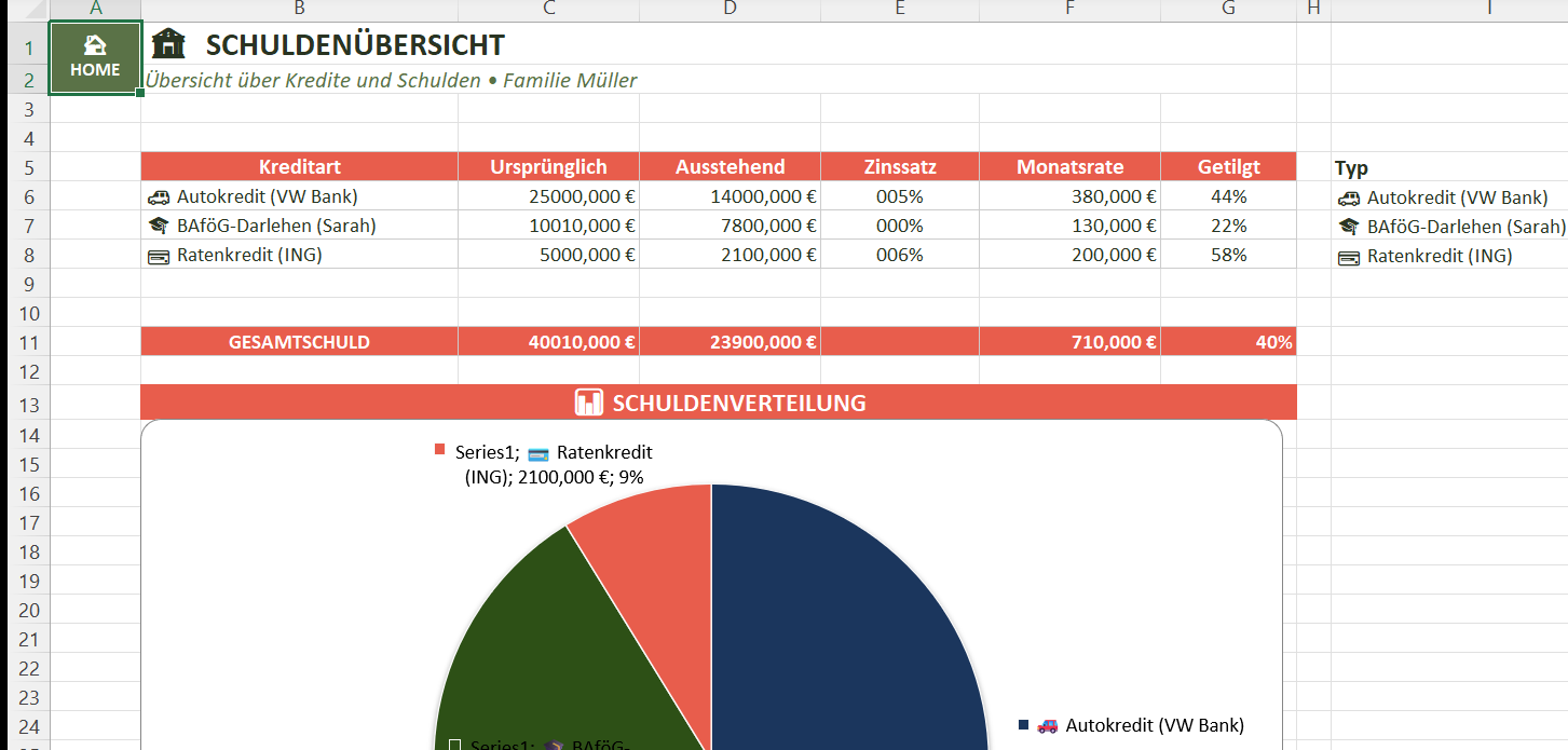 - Schuldenübersicht mit Tilgungsfortschritt pro Kredit