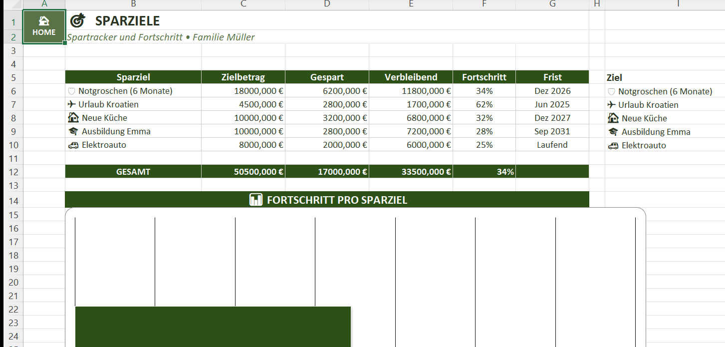 Verfolgen Sie Ihre Sparziele wie Notgroschen, Urlaub oder neue Küche. Fortschrittsprozent und Restbetrag werden automatisch berechnet.