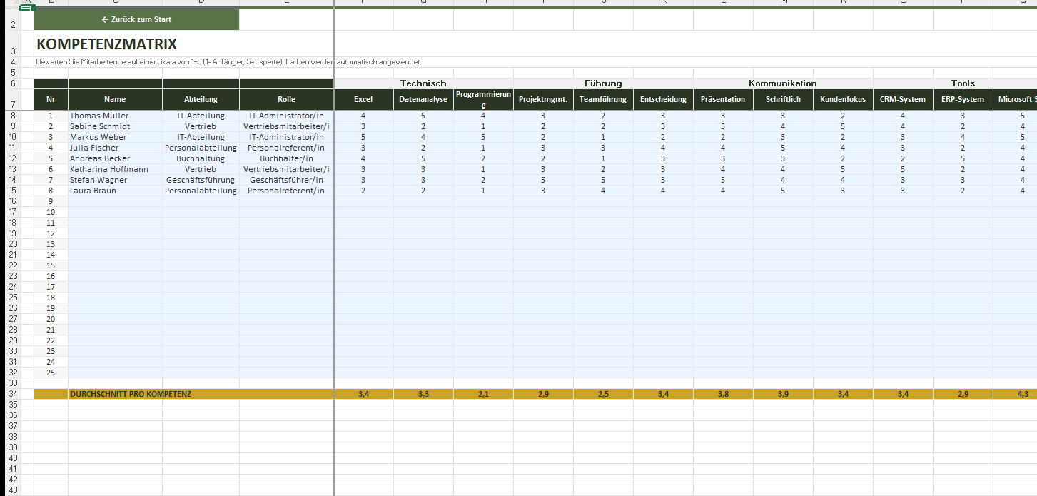 Bewerten Sie 25 Mitarbeitende in 12 Kompetenzen auf einer Skala von 1–5. Automatische Heatmap-Farben und Durchschnittswerte pro Person und Kompetenz.
