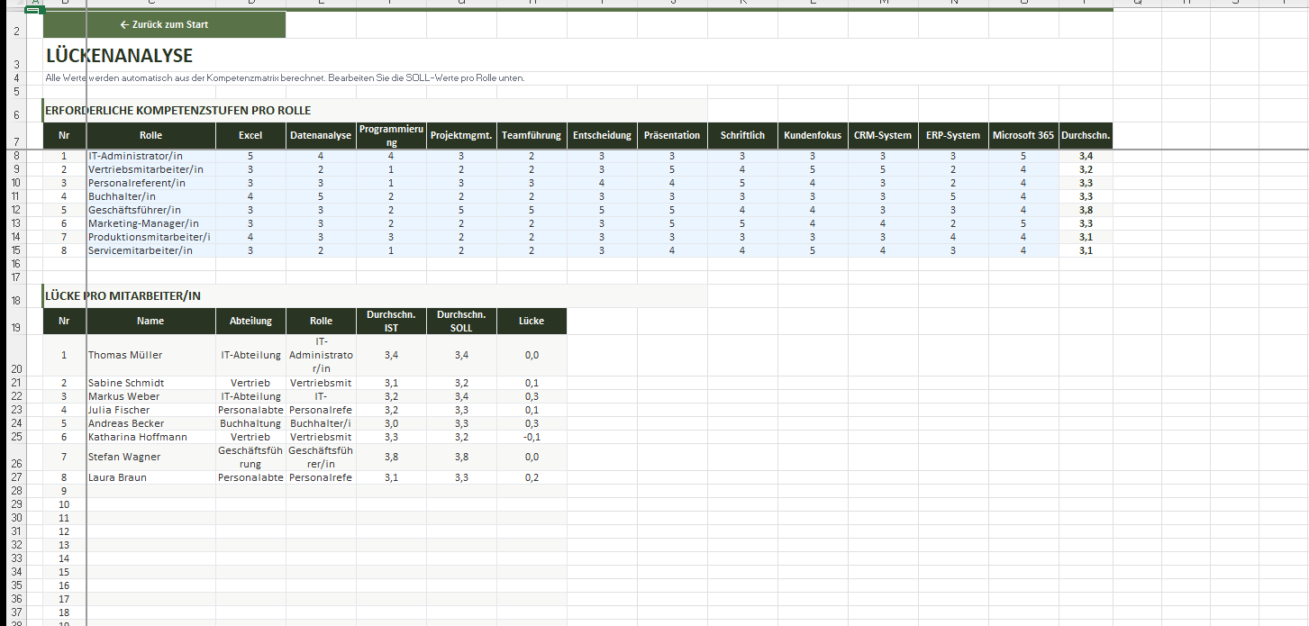 - Lückenanalyse berechnet automatisch die Differenz IST vs. SOLL pro Rolle