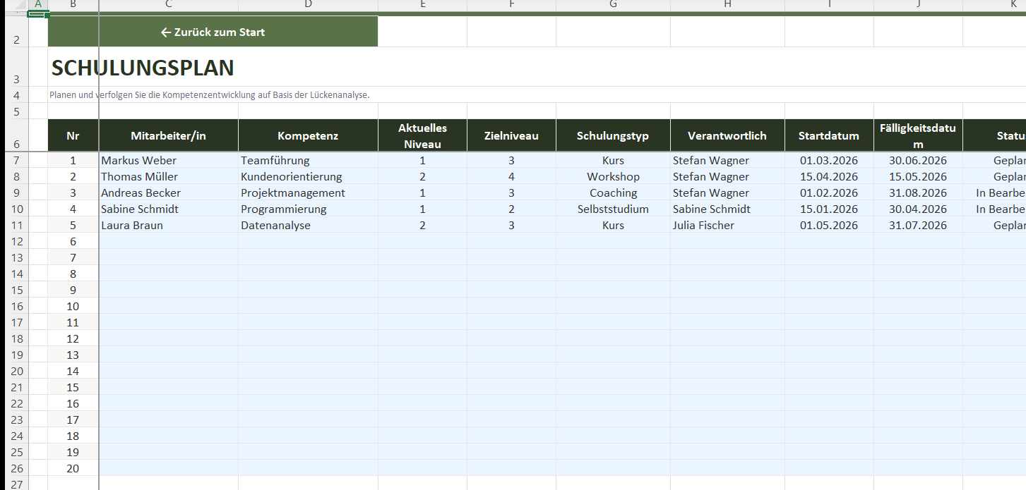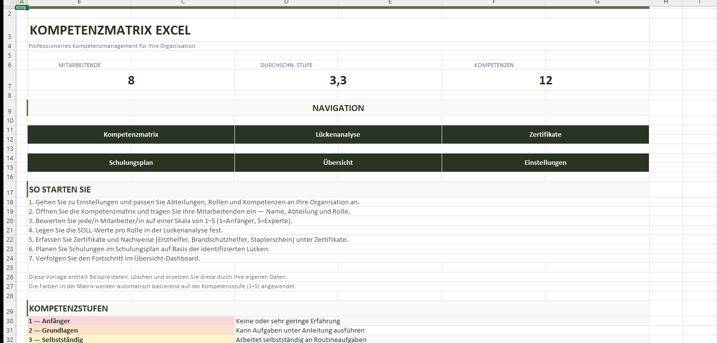 Sie suchen eine Kompetenzmatrix in Excel, mit der Sie Qualifikationen Ihres Teams erfassen und Entwicklungsbedarf sofort erkennen? Diese Vorlage liefert Ihnen ein vollständiges System — von der Bewertung über die Lückenanalyse bis zum Schulungsplan — ohne selbst Formeln erstellen zu müssen.
