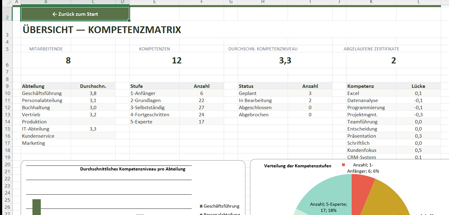 Visuelles Dashboard mit 4 Diagrammen: Abteilungsniveaus, Stufenverteilung, Lücken und Schulungsstatus.