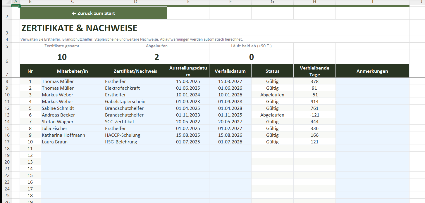 Ersthelfer, Brandschutzhelfer, Staplerschein & Co. mit automatischer Ablaufwarnung und Restlaufzeit in Tagen.