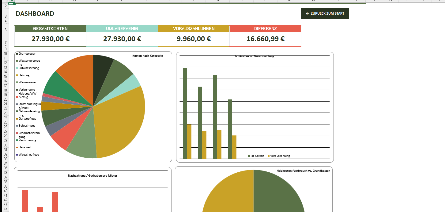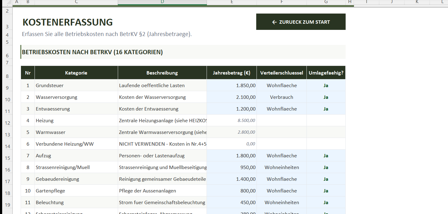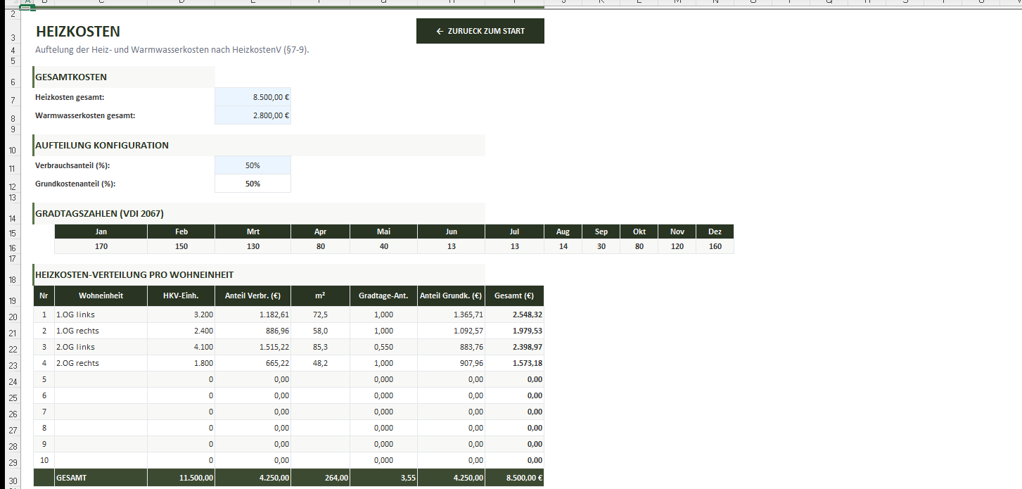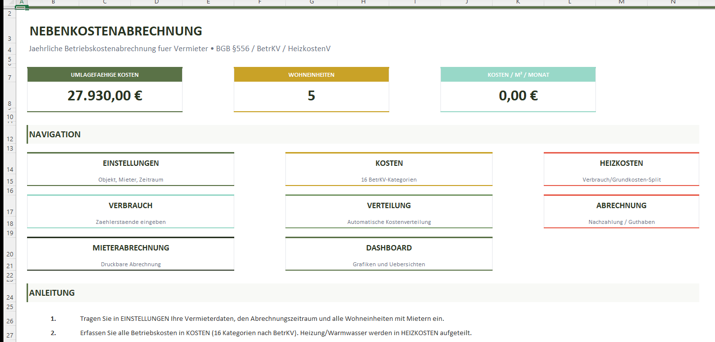 Die Vorlage umfasst 9 Arbeitsblaetter, 652 Formeln und 4 Diagramme. Geeignet fuer bis zu 10 Wohneinheiten mit 5 Verteilerschluesseln, tagesgenauer Abrechnung und separater Heizkostenberechnung nach HeizkostenV.