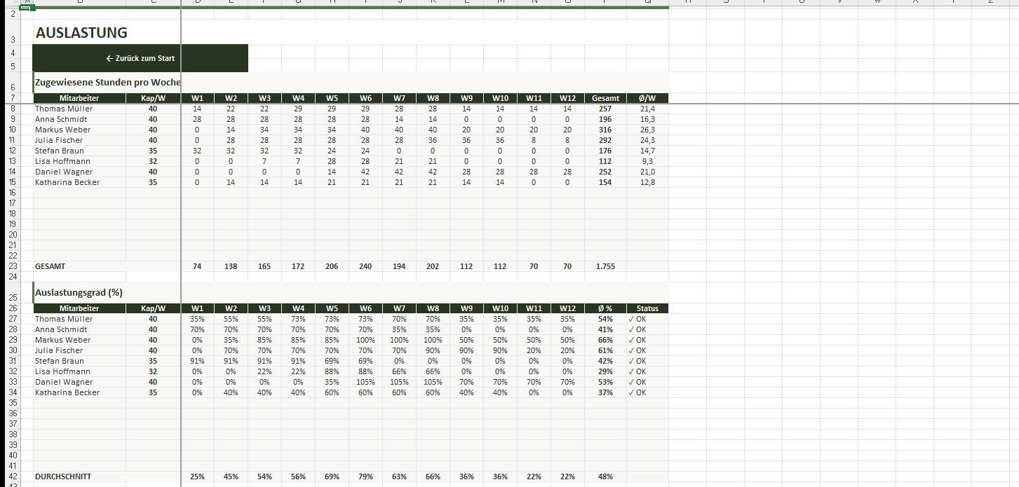 • Auslastung pro Mitarbeiter und Woche sofort sichtbar