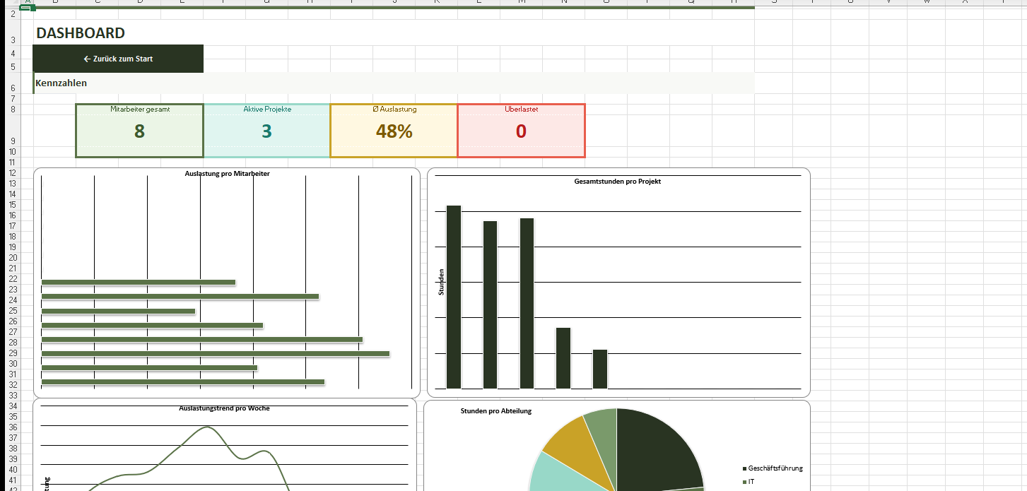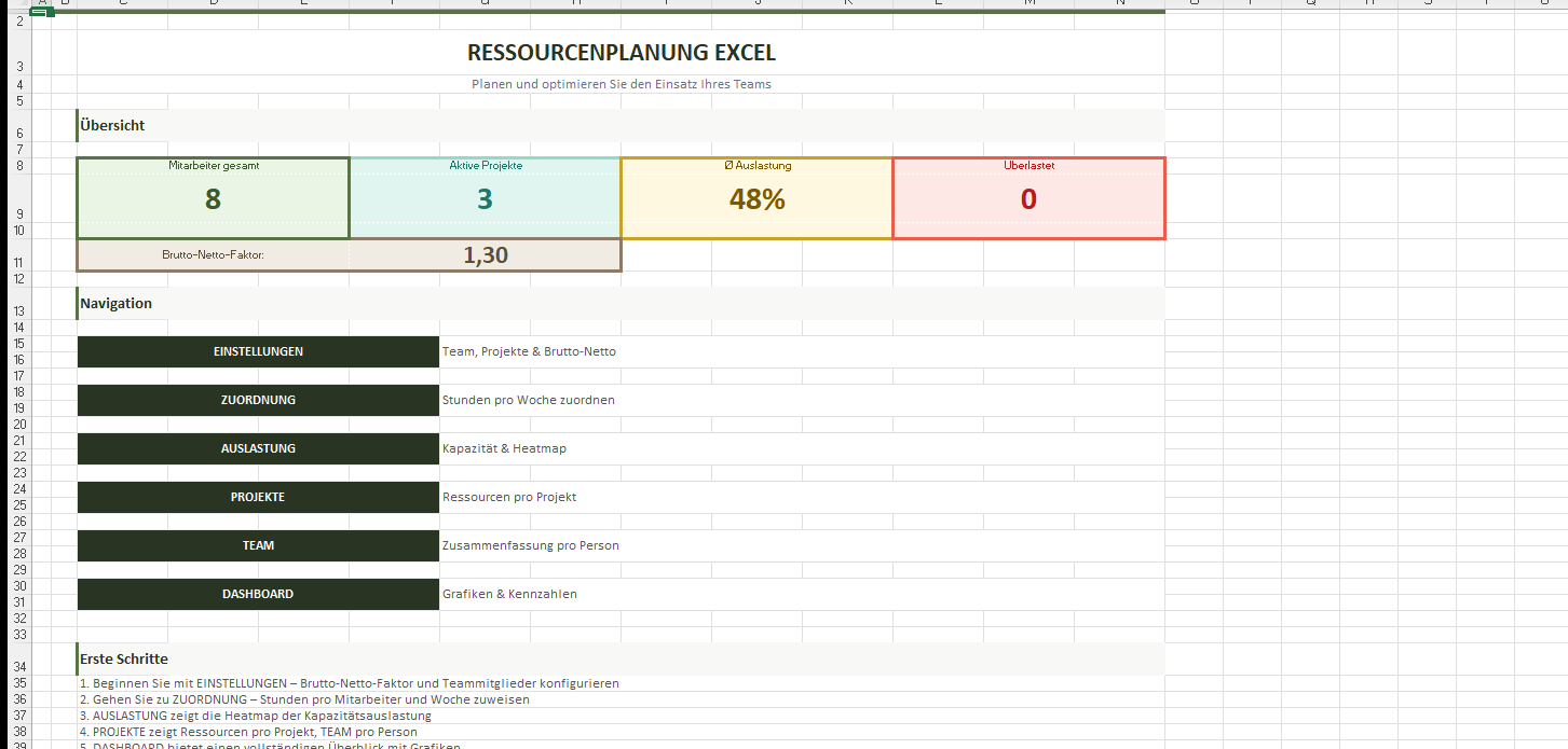 Eine professionelle Ressourcenplanungs-Vorlage in Excel mit Brutto-Netto-Kapazitätsberechnung, 12-Wochen-Planung, Auslastungs-Heatmap, Projektübersicht und Dashboard mit 6 Diagrammen. Entwickelt für deutsche Teams und Unternehmen.