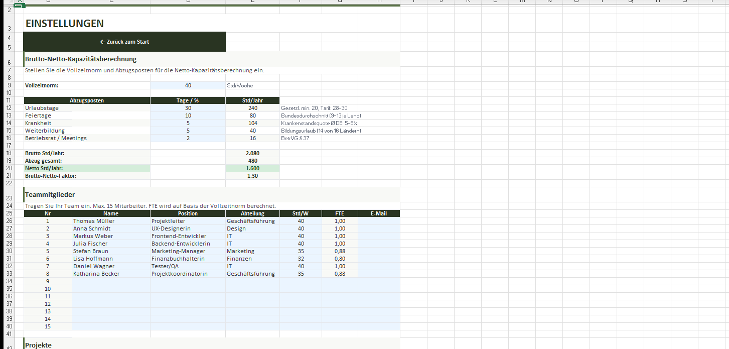 Die Vorlage enthält 7 Arbeitsblätter mit über 1.990 automatischen Formeln, einer Brutto-Netto-Berechnung für die reale Jahreskapazität und eine Heatmap, die Überlastung sofort sichtbar macht. Planen Sie bis zu 15 Mitarbeiter über 10 Projekte in einem 12-Wochen-Horizont.
