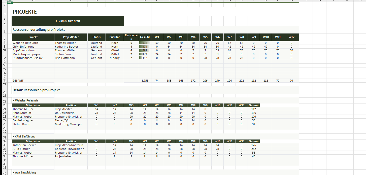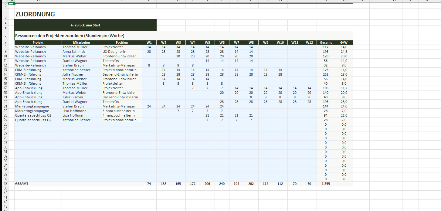 Weisen Sie Mitarbeiter zu Projekten zu und planen Sie Stunden pro Woche über einen 12-Wochen-Horizont. Dropdown-Listen für Mitarbeiter und Projekte. Automatische Summen und Durchschnitte pro Zeile.