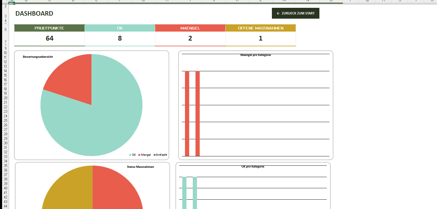 4 Diagramme: Bewertungsübersicht, Mängel pro Kategorie, Prioritätsverteilung und Maßnahmenstatus.