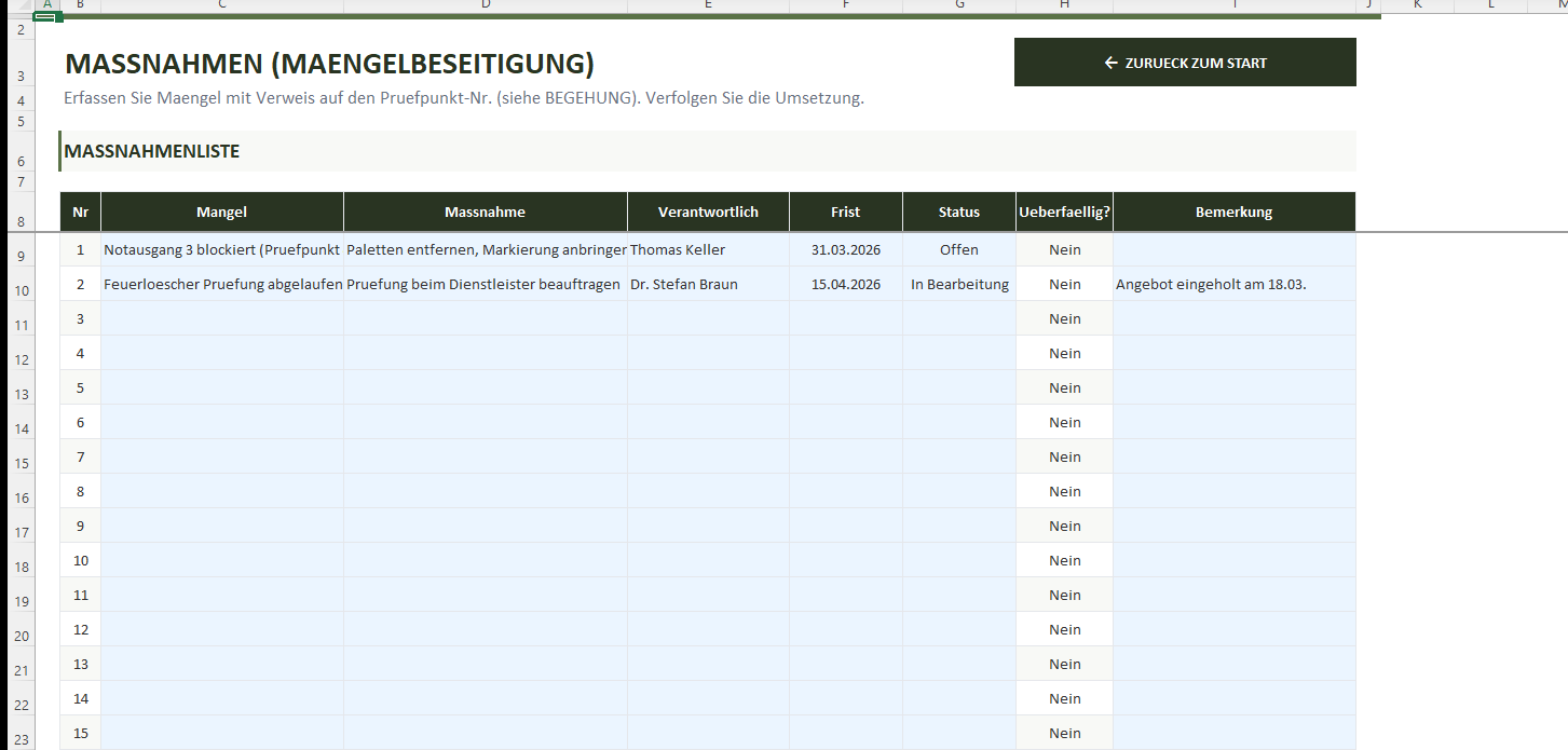 - Direkte Verknüpfung: Mangel → Maßnahme → Verantwortlicher → Frist