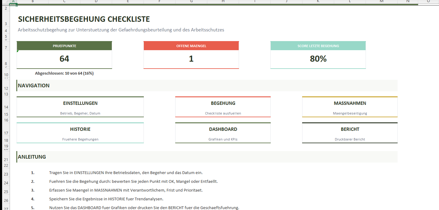 Sind Sie Fachkraft für Arbeitssicherheit, Sicherheitsbeauftragter oder Betriebsleiter und möchten regelmäßige Begehungen strukturiert durchführen? Diese Excel-Checkliste bietet 64 Prüfpunkte in 14 Kategorien, direkt verbunden mit einem Maßnahmenplan mit Fristenkontrolle.