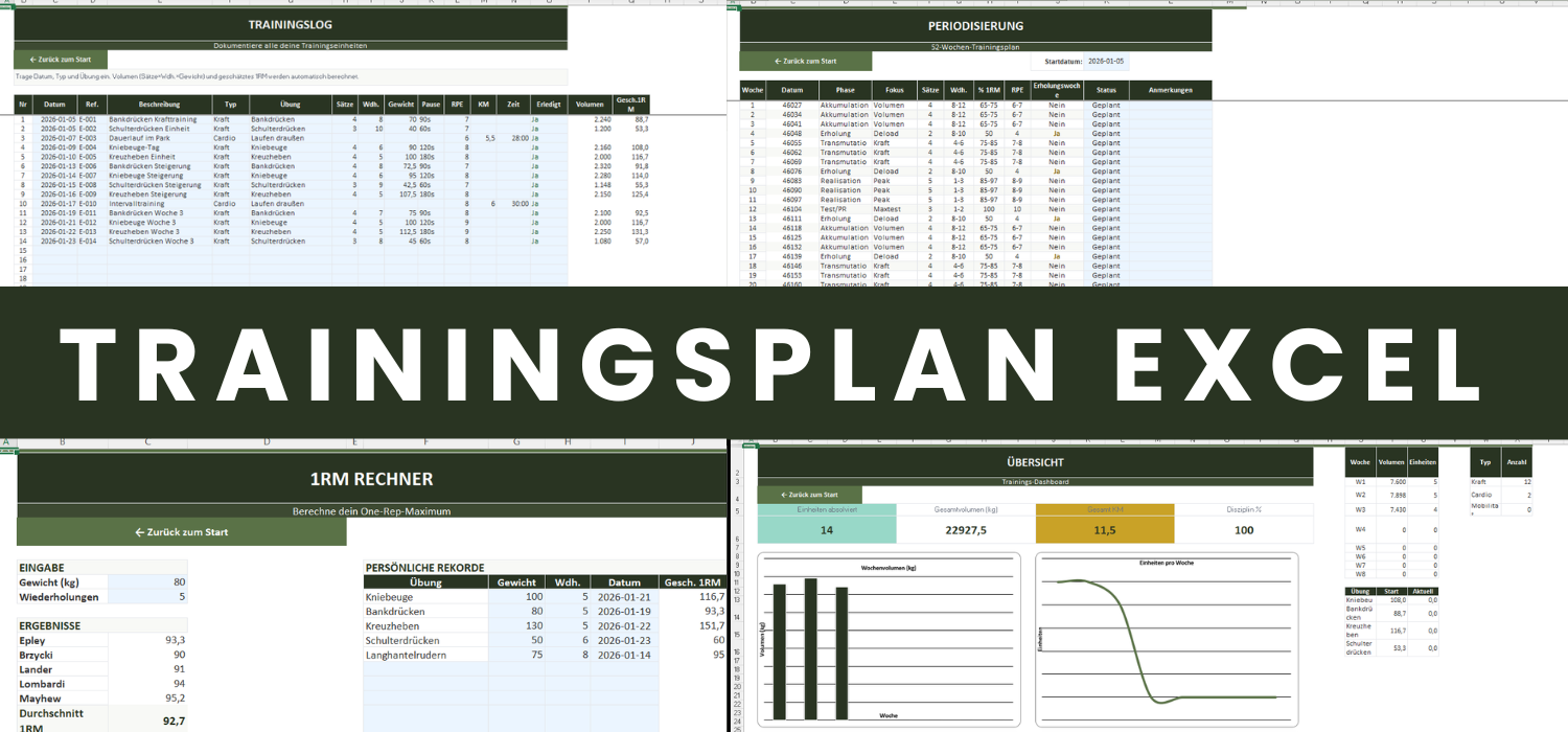 Trainingsplan Excel – komplettes Logbuch mit 105 Übungen, Diagrammen und Periodisierung