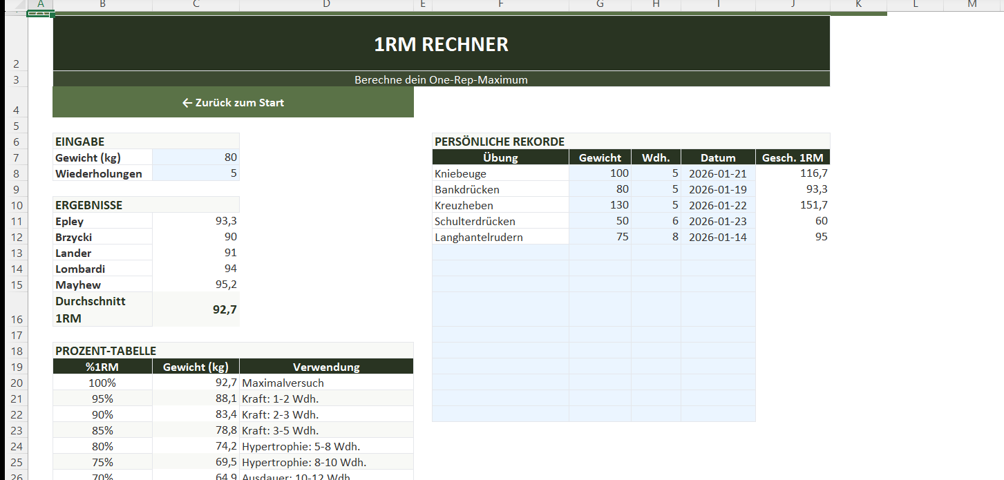 Berechne dein geschätztes 1RM mit der Epley-Formel. Prozenttabelle für 50–100 % deines Maximums und persönliche Rekorde pro Übung.