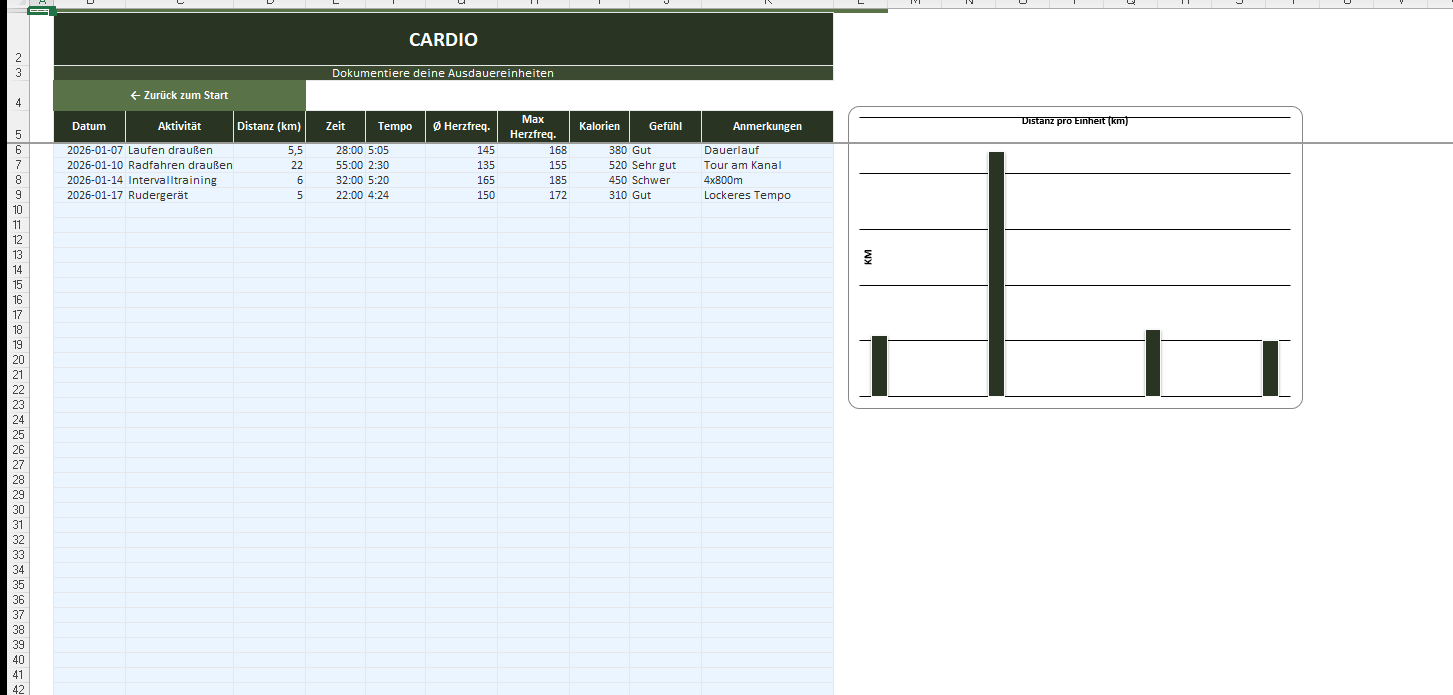 Eigenes Logbuch für Cardio-Einheiten mit Distanz, Zeit, Herzfrequenz, Kalorien und Gefühl. Inkl. Diagramm für Distanz pro Einheit.