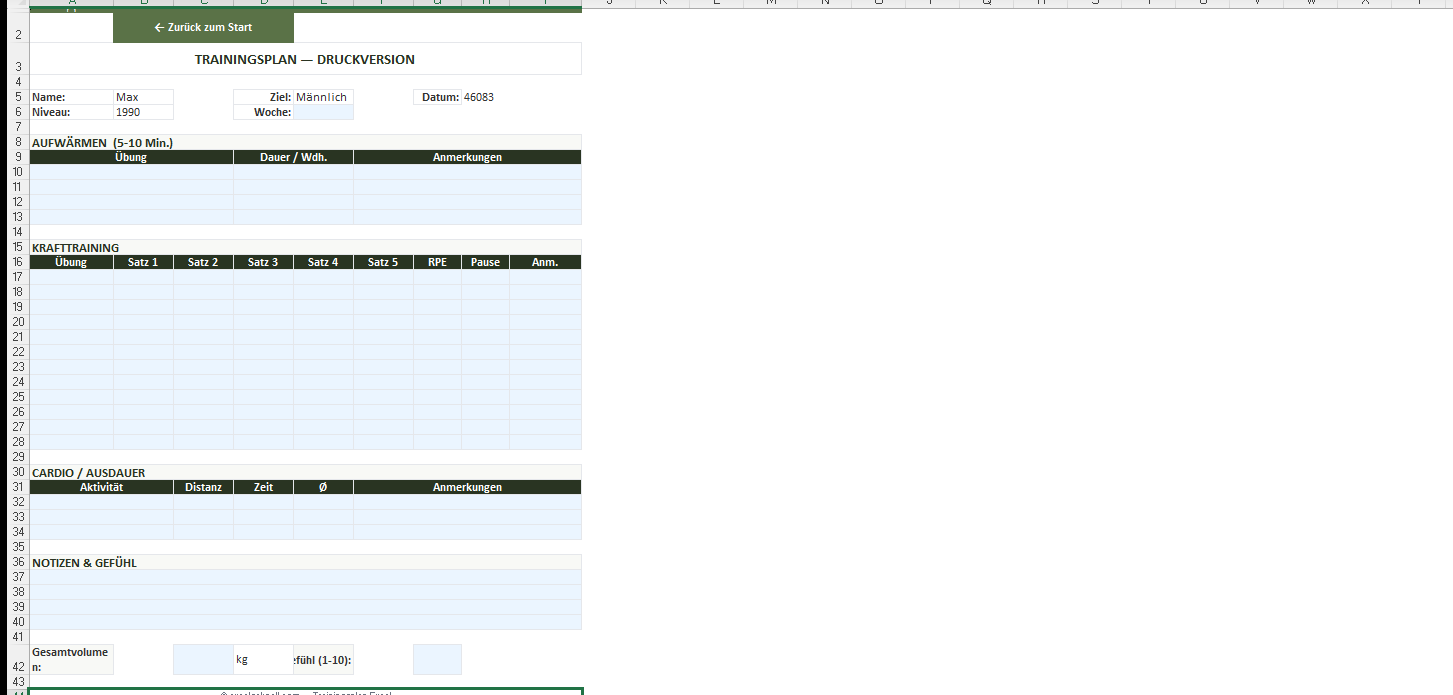 Druckbares Trainingsformular mit Aufwärmen, Krafttraining, Cardio und Notizen. Ideal zum Mitnehmen ins Fitnessstudio.