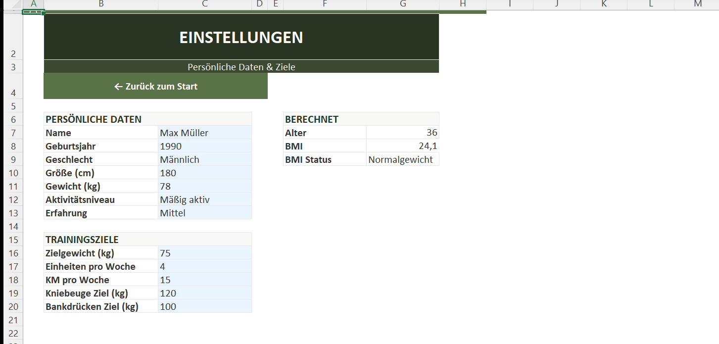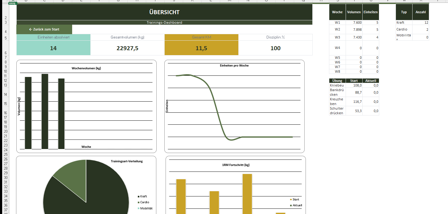 Eine professionelle Excel-Vorlage für Krafttraining mit automatischen Berechnungen, 1RM-Tracker, 52-Wochen Periodisierung, Cardio-Logbuch und visuellem Dashboard. Verfolge deinen Fortschritt ab Tag eins.
