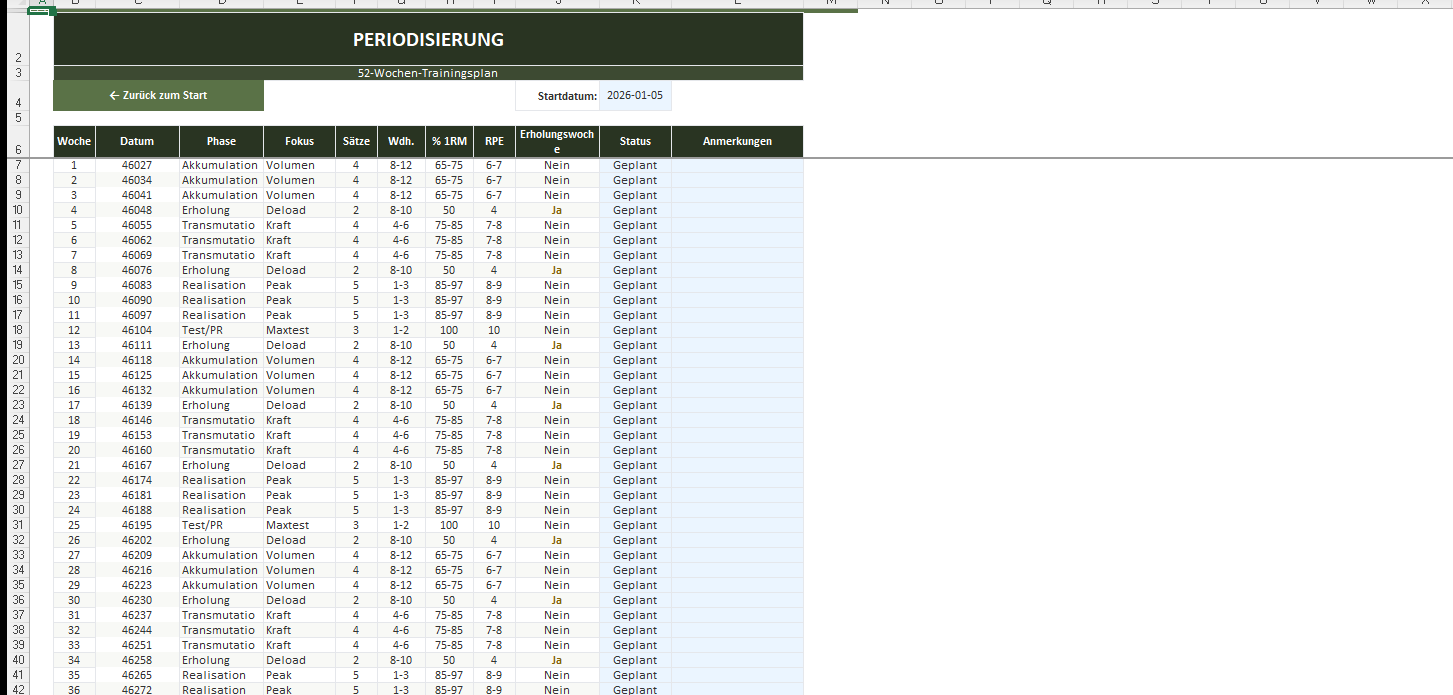 52-Wochen Trainingsplan mit Phasen: Akkumulation, Transmutation, Realisation und Erholung. Sätze, Wiederholungen, Intensität und RPE pro Woche.
